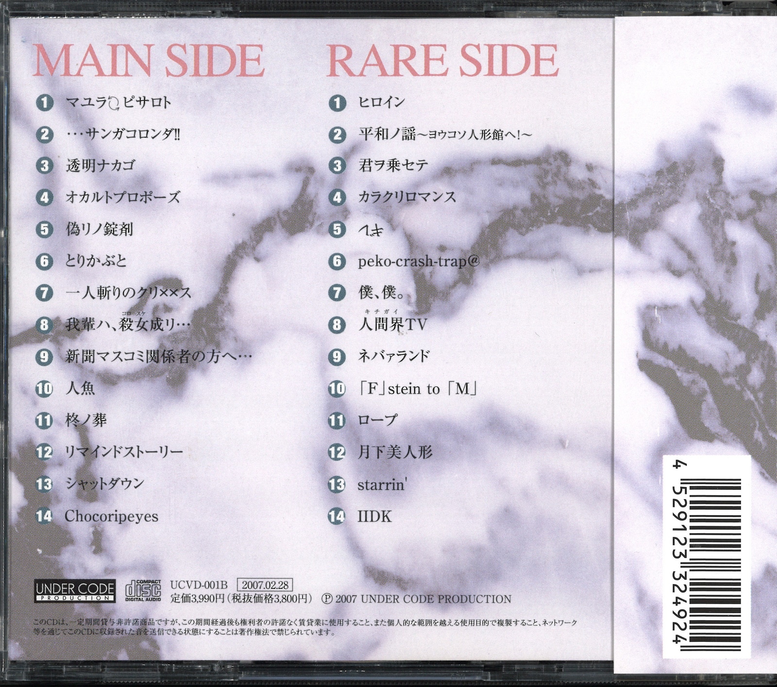 まんだらけ渋谷店【V系】商品一覧はコチラ まんだらけ渋谷店【V系専用アカウント】のX(旧Twitter)はコチラ ※下記を全て読んだ上でご購入をお願い致します。 ※大前提として全て中古品であることを予めご了承下さい。 ※中古品の為、多少のキズ・イタミ・スレ・ヨゴレ・ヤケ・経年劣化等は予めご了承下さい。 ※商品画像は参考画像・サンプル画像の為、実際の商品状態や色味は画像と異なる場合がございます。 ※あくまで参考程度になりますが、商品状態を必ず確認して下さい。 ※商品状態に不安を感じる方は必ず店頭で状態を確認してからご購入下さい。 ■商品状態の一例 (10-9)未開封:未開封品です。(あくまでも中古品です。新品ではありません。) (7)並:中古品として平均的なコンディションです。 (6)並下:並より若干劣る状態です。 (5)イタミ:目立つイタミ等があります。 (5)ヨゴレ:目立つヨゴレ等があります。 (5)盤傷(ディスクキズ):ディスクに目立つキズ等があります。 (5)帯欠:帯が欠品しています。 (3)イタミ/ヨゴレ:目立つイタミ・ヨゴレ等があります。 (3)イタミ/ヤケ:目立つイタミ・ヤケ等があります。 (3)ヤケ/ヨゴレ:目立つヤケ・ヨゴレ等があります。 (3)帯欠/イタミ:帯が欠品、目立つイタミ等があります。 (3)イタミ/盤傷(ディスクキズ):目立つイタミ等あり、ディスクにも目立つキズ等があります。 (2-1)状態要確認:致命的な欠陥・ダメージ等があります。 ■その他状態表記に関して ※キズ・スレ・経年劣化・へこみ・染み・欠品等で表現している場合もございます。 ■CD・DVD・Blu-ray・VHS等の視聴・再生に関して ※一般的に視聴・再生可能な範囲のものを販売していますが、視聴・再生を保証しているわけではございません。 ※機器の相性・各動作環境・リージョンコード等に関しましては販売元メーカーのホームページ等でご確認ください。 ■評価基準に関して ※発売日・発売時期・配布時期等が古いものは経年劣化(イタミ・スレ・ヨゴレ等を含む)を考慮した上で「並」として評価する場合や商品状態に記載しない場合があります。 ※素材・材質・仕様等によっては傷つきやすい・痛みやすい・擦れやすい・汚れやすいもの等がございますが、それらを考慮した上で「並」として評価する場合や商品状態に記載しない場合があります。 ※CD・DVD・Blu-ray等のケースは素材・仕様上、スレがある前提で販売していますので予めご了承ください。 ※プラスチックケース、クリアケース、スリーブ、BOX、アクリル素材、プラスチック素材等は特にスレ・イタミ・使用感が出やすくなっている為、ダメージとは認識せず「並」と評価する場合や商品状態に記載しない場合があります。 ※ディスクの仕様上の問題で表面に汚れや指紋、キズ等が目立つものがありますが、仕様上の問題の為、基本的に「並」と評価しています。 ※紙素材の商品や雑誌等は素材上・仕様上の問題でイタミやスレ、角折れ等のダメージやヨゴレ等があった場合でも「並」と評価する場合や商品状態に記載しない場合があります。 ※ポスターは特性上・素材上の問題でイタミ・角折れ・経年劣化・汚れ等が出やすい為、よほど大きなダメージやヨゴレではない限りは「並」と評価する場合や商品状態に記載しない場合がありますので予めご了承下さい。イタミ等があることが前提の為、商品状態が気になる方は必ず店頭にてご確認下さい。また丸まった状態で発送されます。 ※輸送箱・外箱は商品を運搬・保護等の目的で付属している為、イタミ・汚れ・へこみ・破損・塗りつぶし等のダメージがある場合がございます。予めご了承下さい。 ※衣類に関しては中古品の為、多少のスレ・ヨレ・イタミ・使用感・経年劣化があった場合でも、着用や使用に問題がない場合は「並」と評価する場合や商品状態に記載しない場合があります。予めご了承下さい。 ■特典・帯・付属品等に関して ※特典(ポストカード・フォトカード・ポスター・サイン・缶バッチ・シール・ステッカー・グッズ・ランダム封入等)は、商品状態への記載や掲載画像がない場合は基本的に付属しませんのでので予めご了承下さい。 ※本やCD、DVD等の帯は商品画像にない場合は基本的に付属しません。 ※商品によっては帯が複数種類ある場合がありますが掲載画像は参考画像の為、違う帯の可能性がございます。 ※輸送箱・外箱は商品状態に記載がない場合は基本的に付属致しません。 ※メーカー外袋、チラシ等は基本的に付属していません。 ※外袋の有無やイタミ・ヤブレ等は商品状態や価格に含まれませんので予めご了承ください。 ※応募券・シリアルコード・DLC等は基本的に付属しません。 ※応募券・シリアルコード・DLC等は中古品である為、保証対象外となります。 ■その他 ※ネコポス(メール便)での配送遅延・商品紛失・破損・返品・交換等の補償は、弊社では一切の責任を負いかねます。 ※ネコポス(メール便)はプチプチ等を巻かずに商品をそのまま封筒に入れ