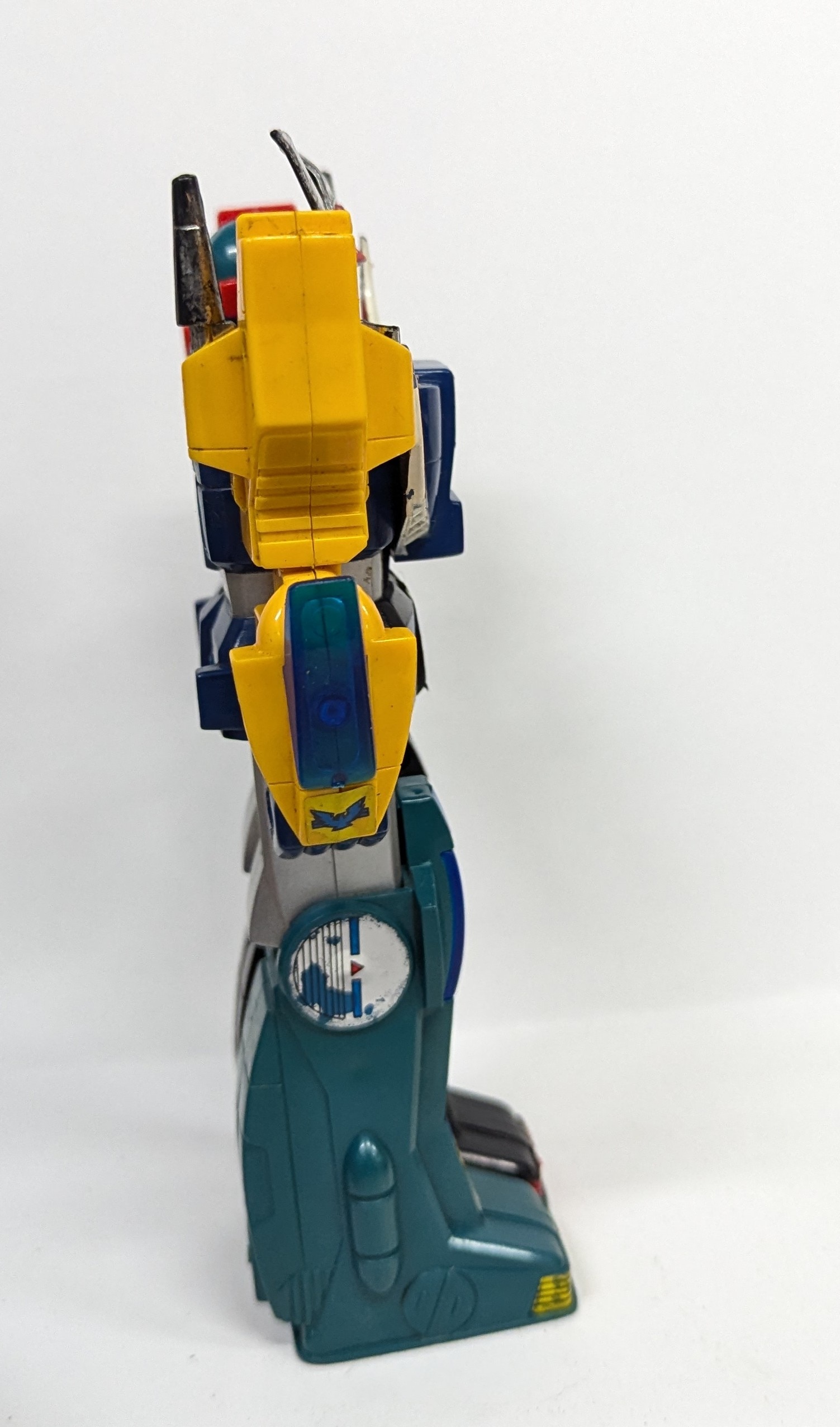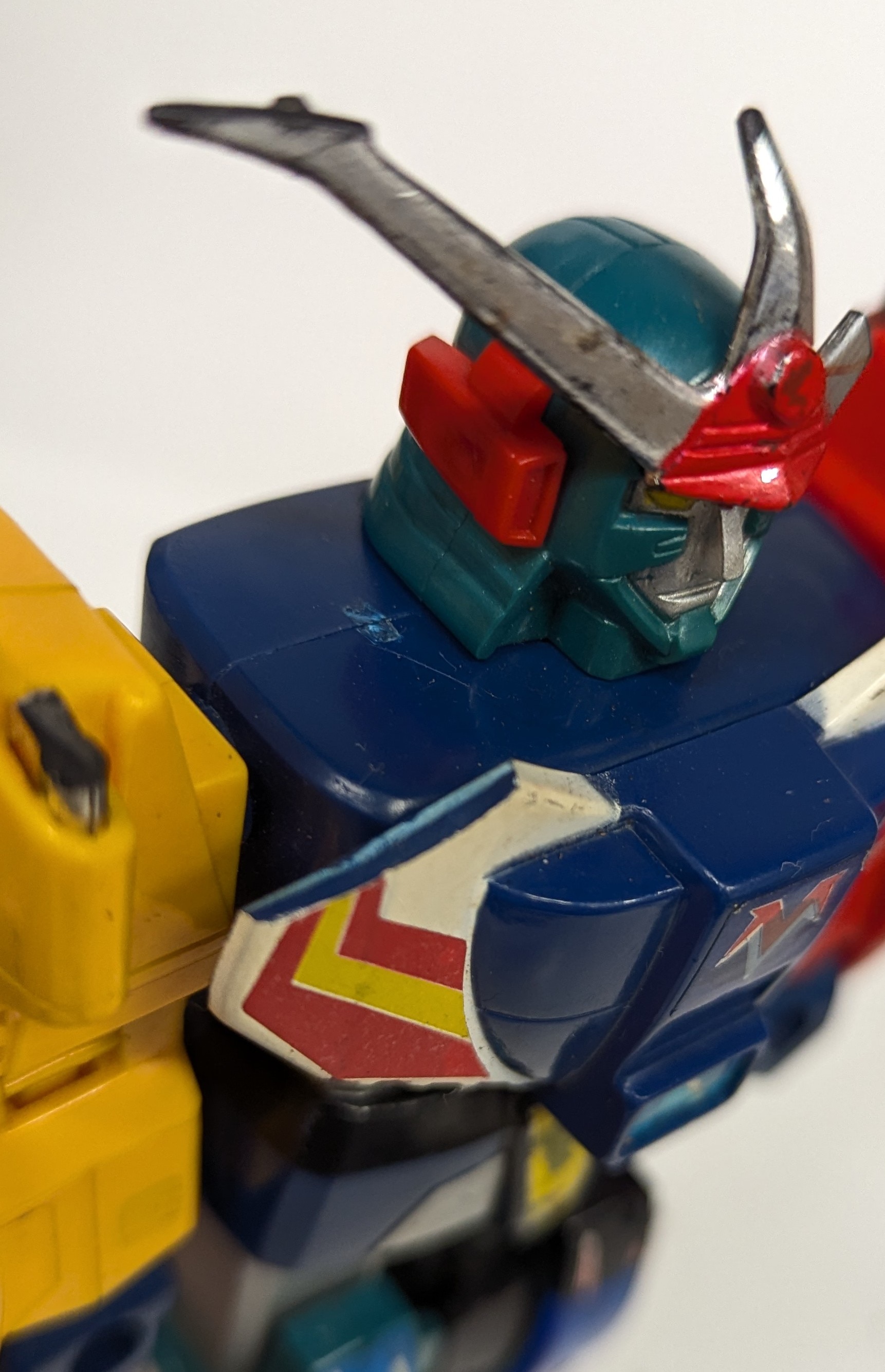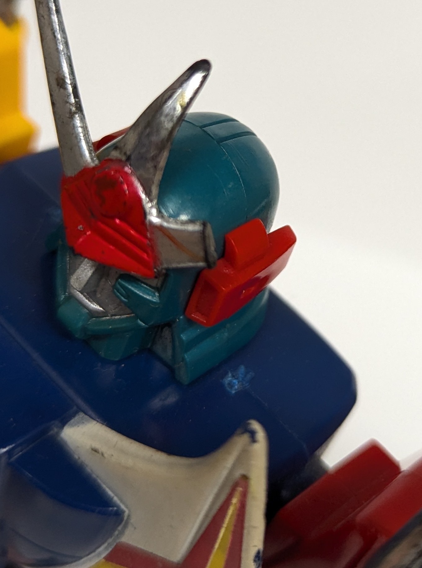 商品状態: 本体のみ・塗装。メッキいたみ・ヤケ・傷/左アンテナ・右胸当て・左右のバイクマフラー一部欠損/シールいたみ・剥がれ・螺子錆/ハンドブラスター×3・ニューバクソード・紙類欠品