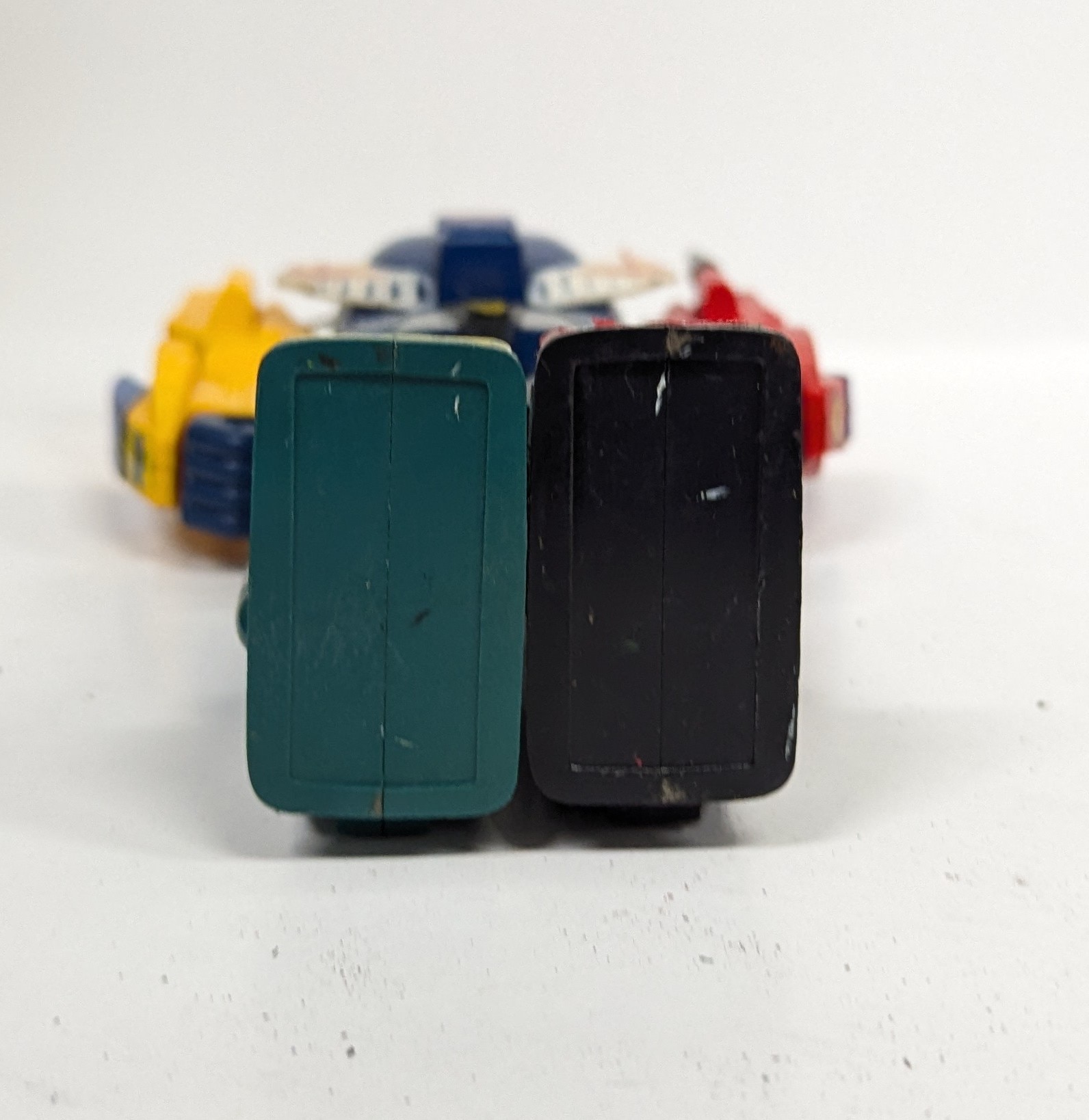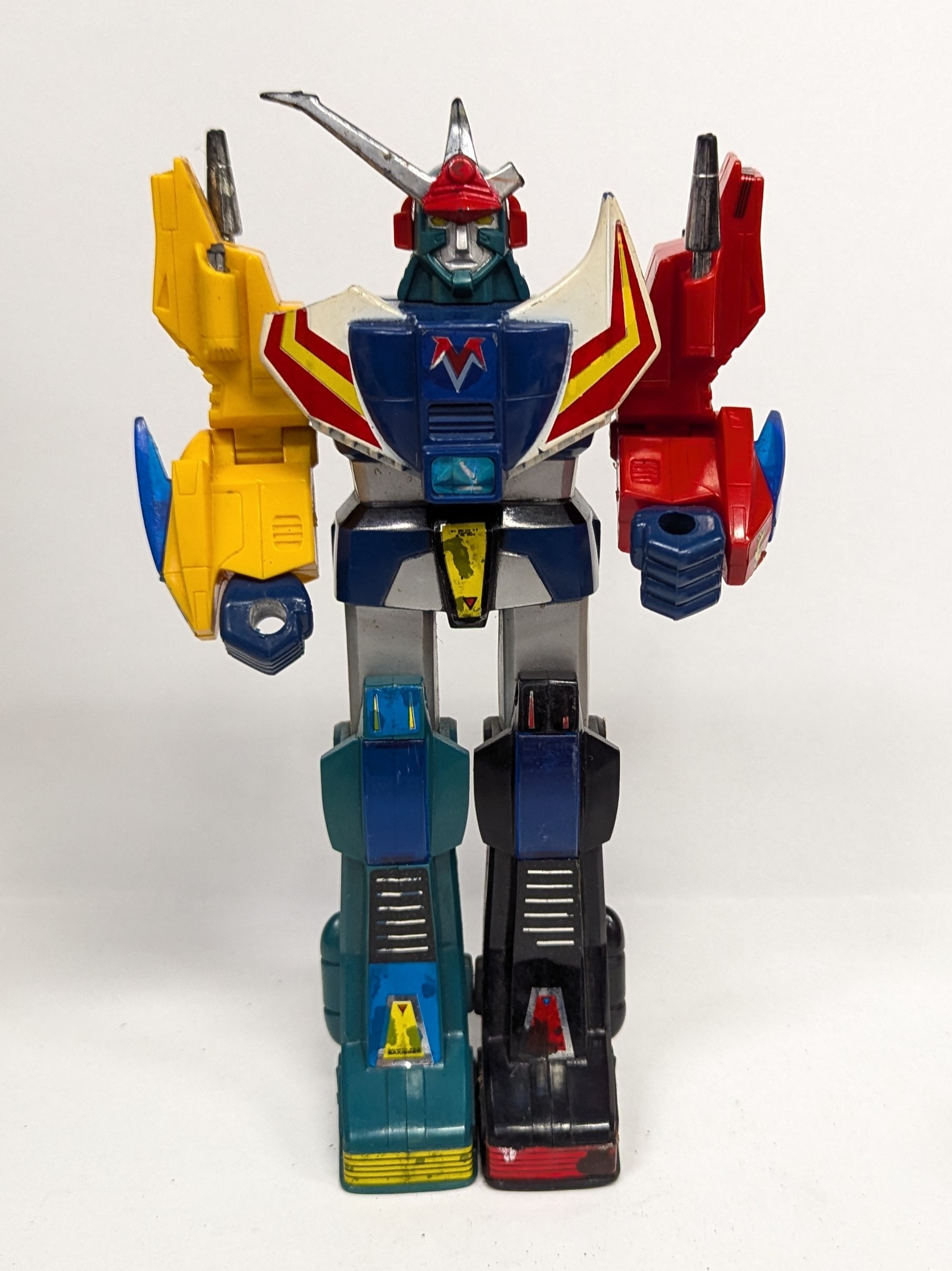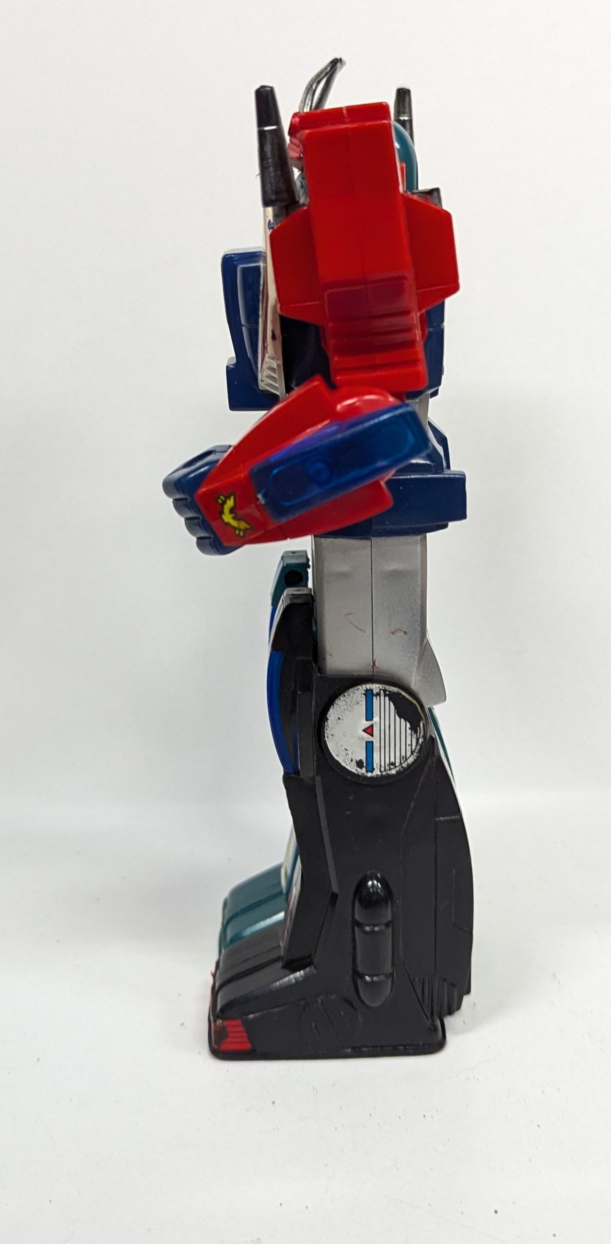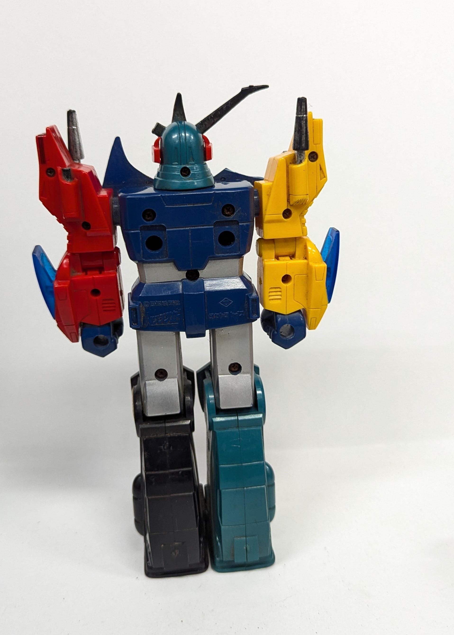 商品状態: 本体のみ・塗装。メッキいたみ・ヤケ・傷/左アンテナ・右胸当て・左右のバイクマフラー一部欠損/シールいたみ・剥がれ・螺子錆/ハンドブラスター×3・ニューバクソード・紙類欠品