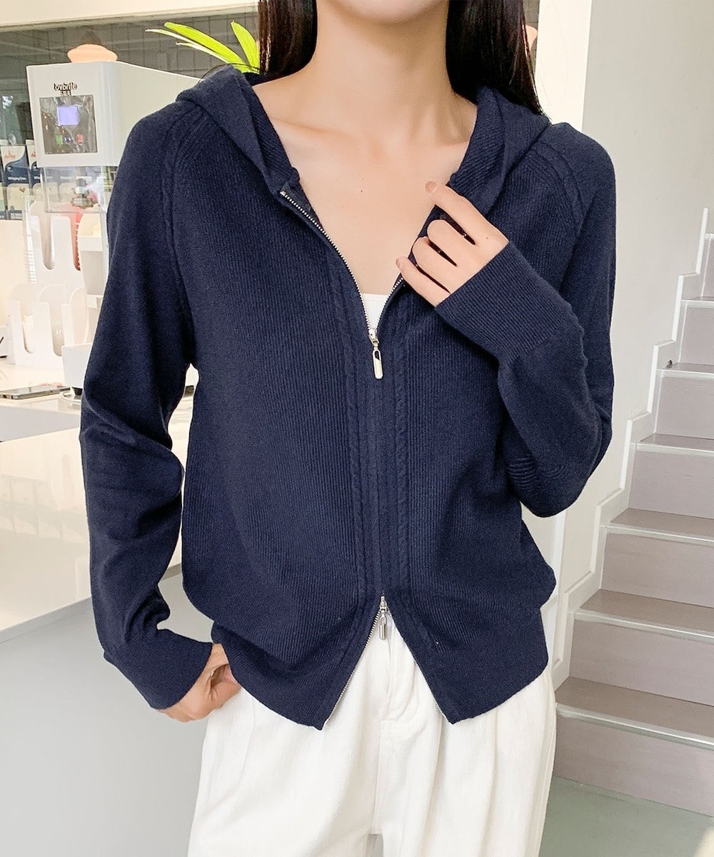 シンプルで着回しやすい無地デザインに、首元をしっかりと包み込むハイネック仕様をプラスしたフード付きニット。カジュアルな雰囲気を持ちながらも、ハイネックで大人な女性らしさUP。ダブルジップ仕様でシルエットのアレンジがしやすく、幅広いコーディネートに活躍。