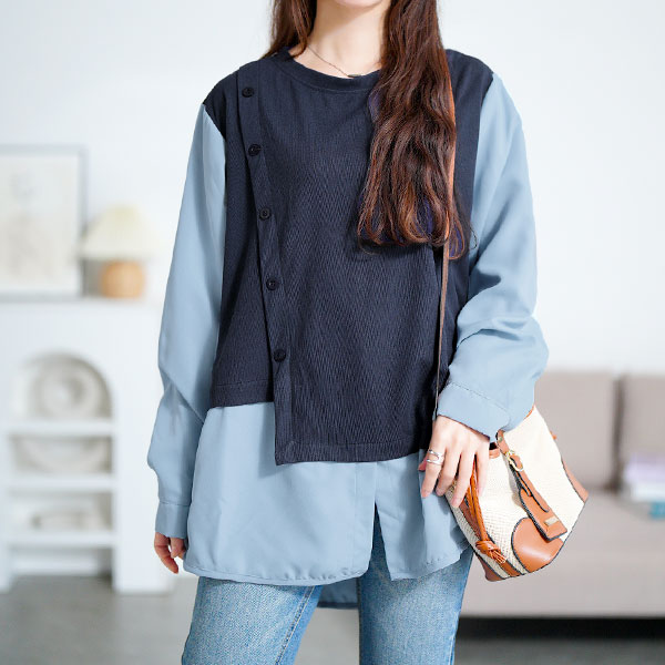 一枚でレイヤードスタイルが完成する、ベストドッキングプルオーバー。アシンメトリーに配置されたベストデザインと水色のシャツがドッキングした今季注目の一着。飾りボタンとステップヘムの裾が目を引き、着るだけでこなれた印象に。ヒップラインまでしっかり隠れる丈感と縦ラインを強調するシルエット。気になるお腹まわり、ヒップも自然にカバーしてくれます。ベストは伸縮性のあるニットで動きやすく、シャツは軽やかで通気性のよい素材を使用。長時間の着用も快適で、お手入れも簡単。季節の変わり目にも使える万能デザインで、コーデにひとさじの個性をプラスしてくれます。