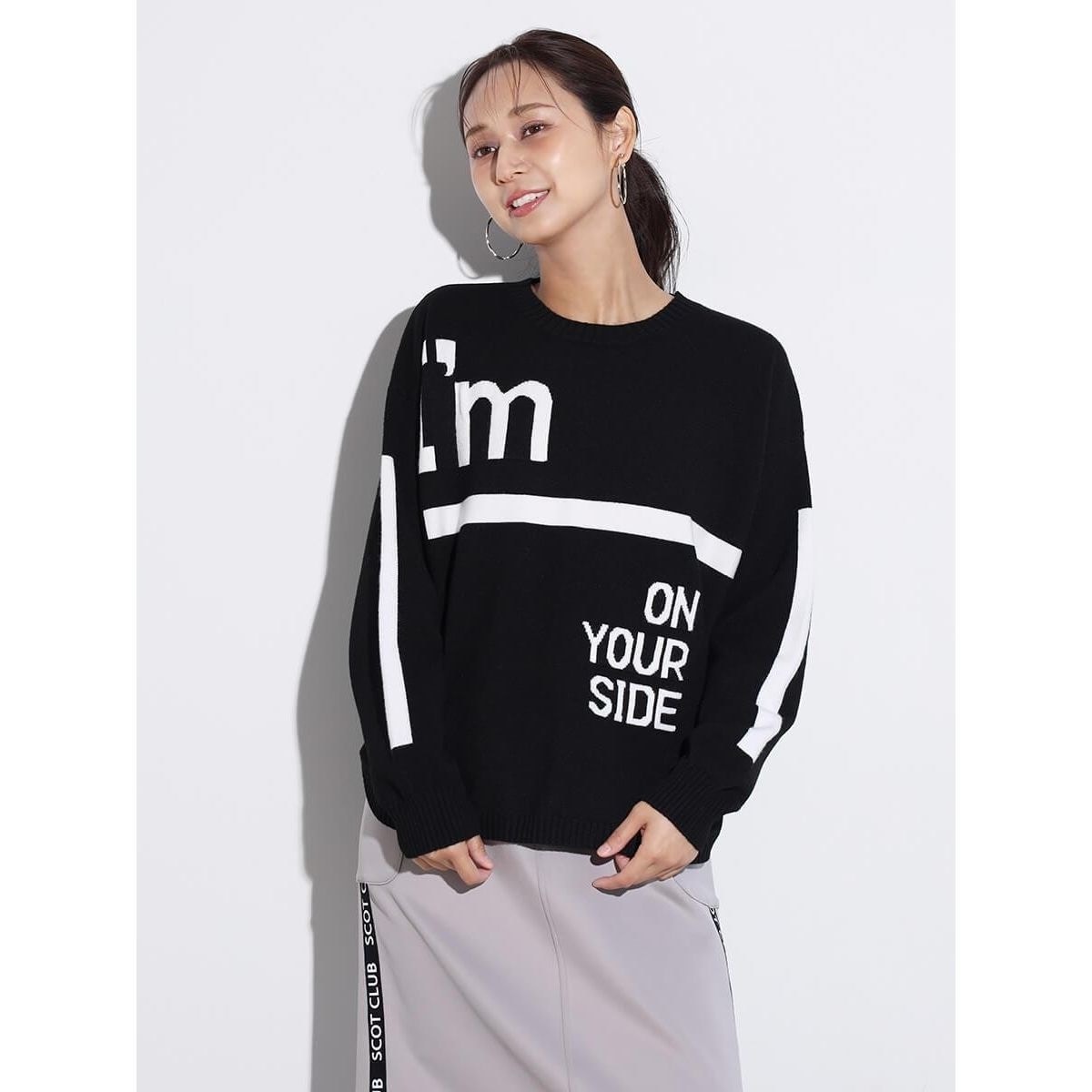 バイカラー配色のロゴデザインが目を惹き、スタイリングの主役になってくれるニットトップス。