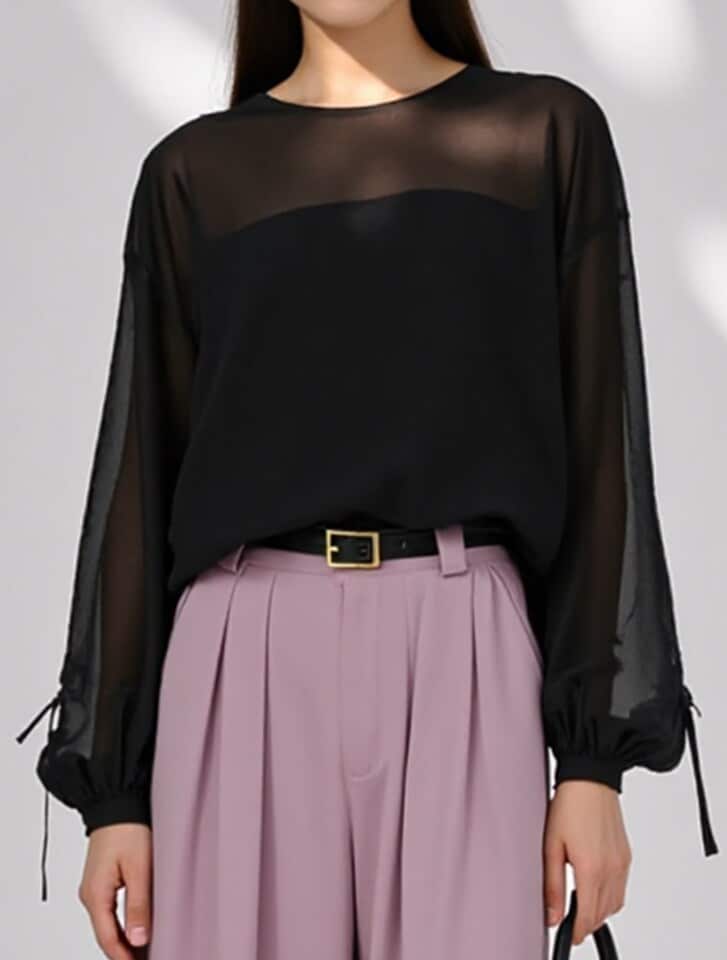 ほどよい透け感が女性らしい印象のシアーブラウス。大胆にスリットが入った袖に、3つ並んだリボンがアクセントをプラスしてくれます。さまざまなボトムスと合わせやすく、カジュアルからきれいめまで幅広いスタイリングに活躍するアイテムです。こちらのアイテムはブラウスのみとなっております。