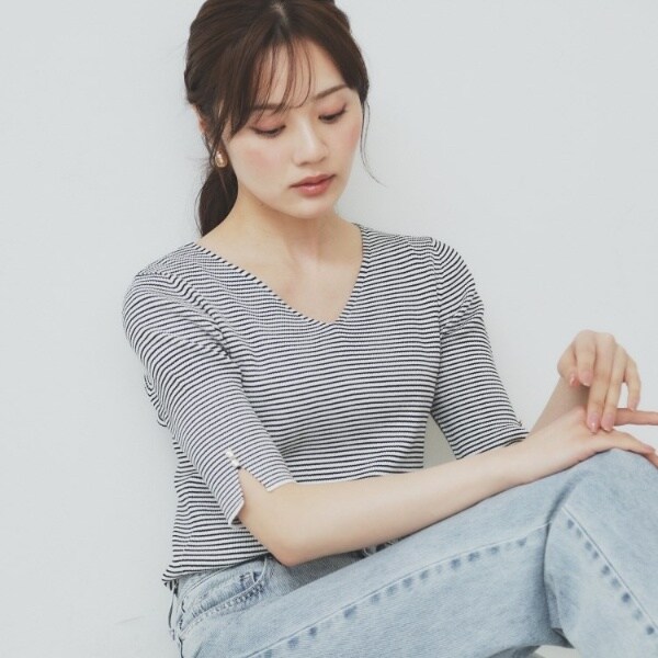 ・リブ編みが程良くフィットし、すっきりしたシルエットがスタイルを美しく見せ、五分袖のデザインが着心地良く軽快さを演出します。