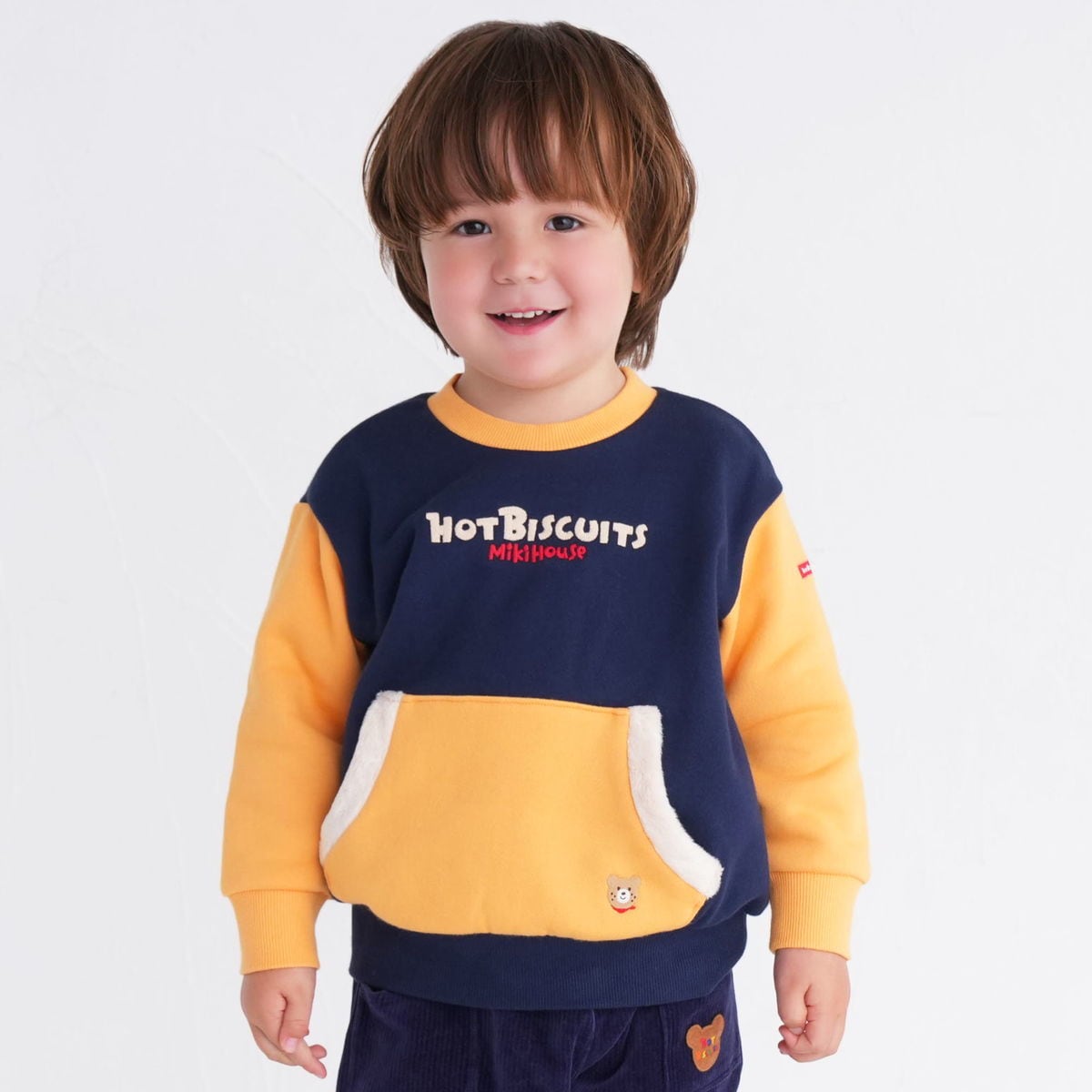 ミキハウス ホットビスケッツのバイカラー配色の裏起毛トレーナー。