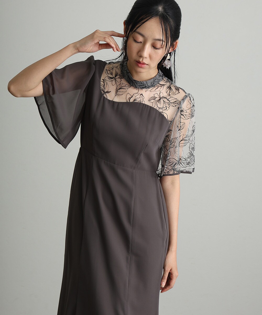 デコルテから腕にかけてのレースの透け感が、上品で華やかな印象に。