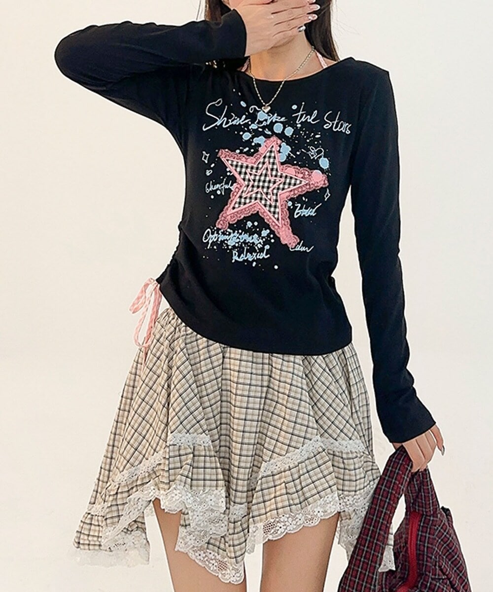 フロントに配置されたギンガムチェックの「スターモチーフ」と、スプラッシュ風の英字ロゴプリントが映えるY2Kロングスリーブトップス。