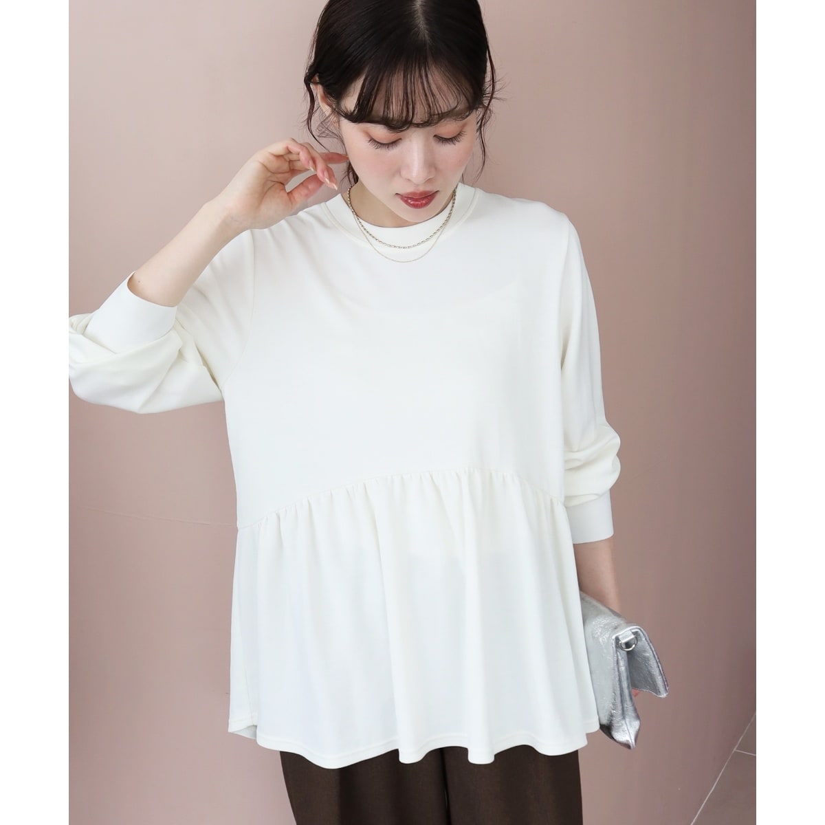 ウエスト部分から大胆にギャザーを入れたフレアシルエットのプルオーバーで、丈の短いニットやベストなどとのレイヤードにも最適な1着です。