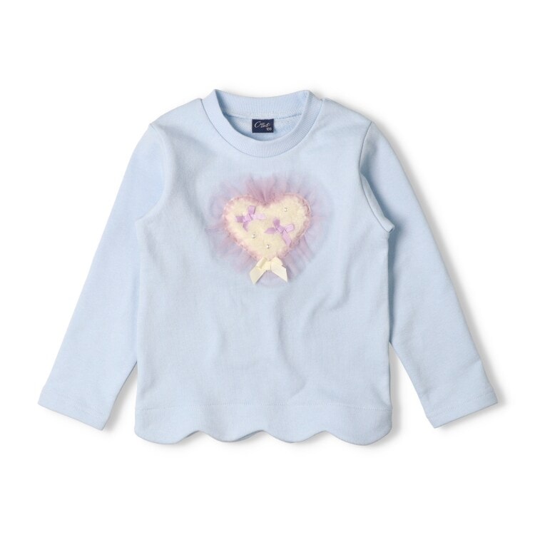 裾はスカラップデザイン。チュールやリボン、パールを使用したハートのモチーフが女の子らしい!秋から春まで長く着られる裏毛素材のトレーナー、スウェット。(ベビーサイズのみ肩ボタン仕様になります。)【アイテム】トップス シンプル ガーリー フェミニン カジュアル お洒落 オシャレ かわいい 可愛い 普段着 デイリーウェア お出かけ着 お外着 お外遊び着 子ども こども 女児 女の子 ガールズ キッズ ベビーサイズ トドラーサイズ 幼稚園 保育園 小学校 通園 通学 小学生 2025年秋冬物新作 丸高衣料 ロングスリーブ 長袖 ピンク サックス 水色 コットン100% 綿100%
