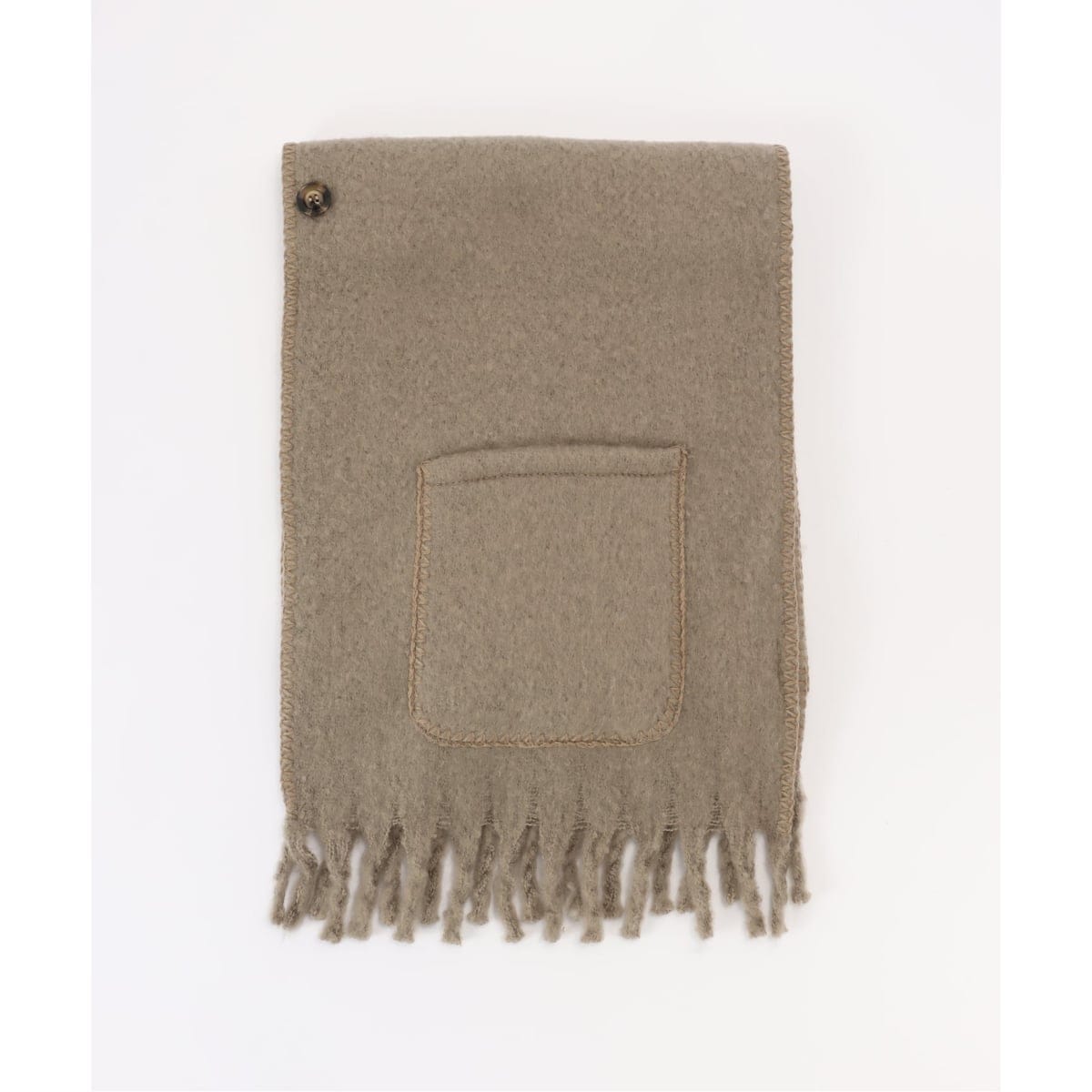 ふんわりとした素材感で温かみのあるフリンジマフラーです。ボタン付きで前を止められるので肩掛けしやすく、両サイドにポケットが付いたデザインになります。