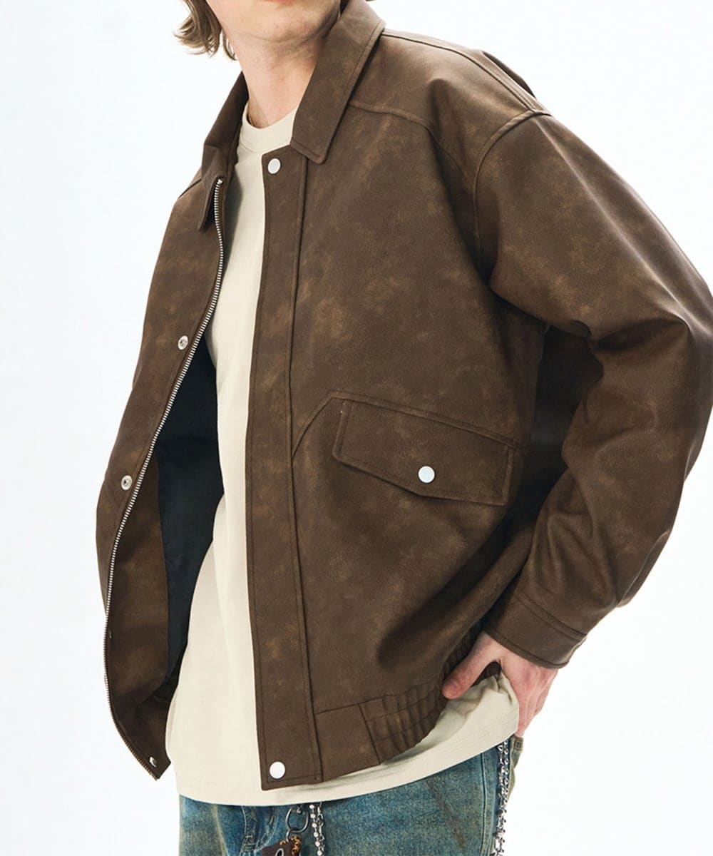 ウォッシュ加工のようなヴィンテージ感あるフェイクスエード素材を使用した、大人カジュアルにぴったりなジップジャケット。