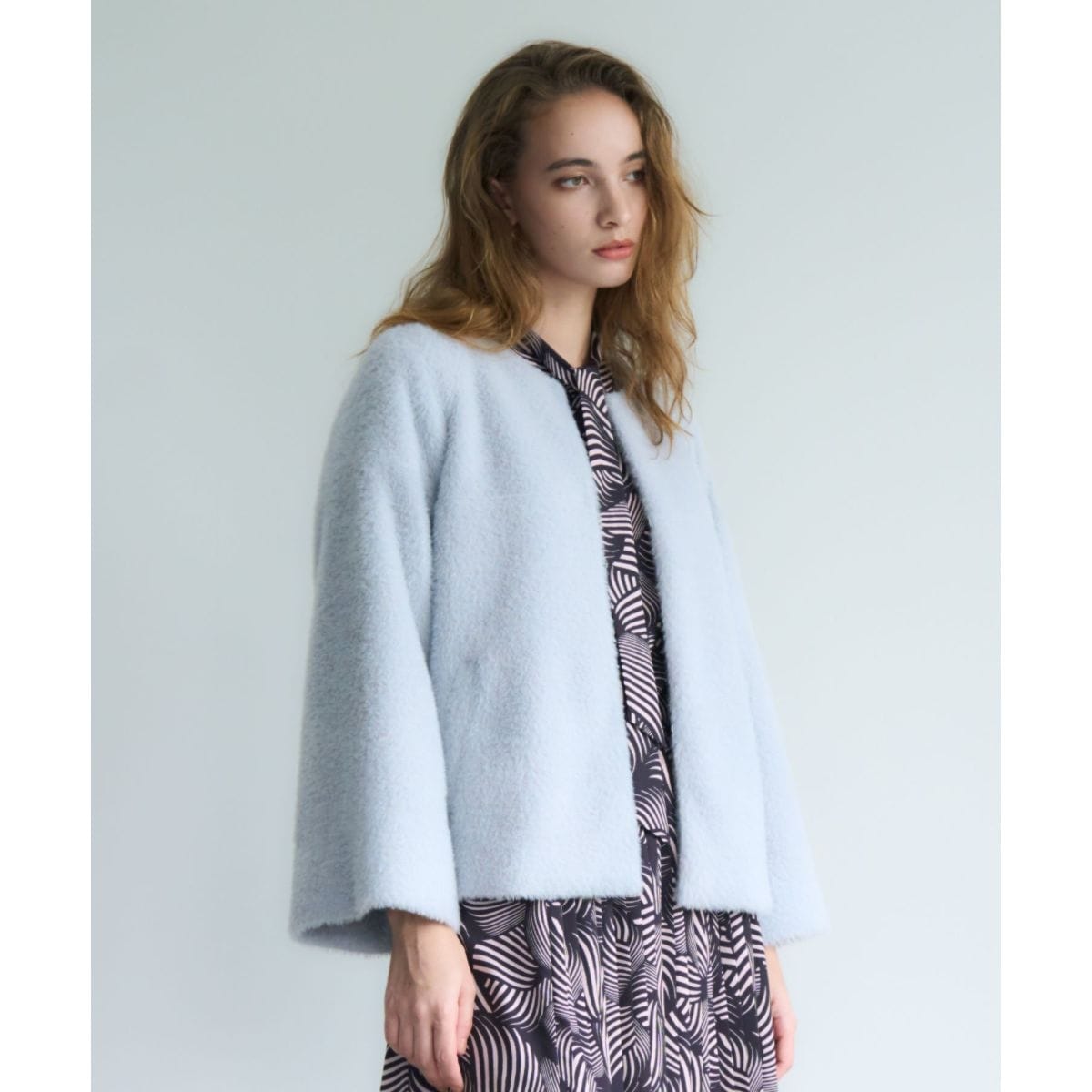 起毛感が見た目にも暖かくシーズンムードを高めるショートコート。首元をすっきりと見せるノーカラーなので、タートルネックやマフラーとも好相性。フロントは鍵ホック開閉仕様で閉じて着用した際も上品ですっきりとした印象をキープします。肩パッドのないナチュラルなシルエットで気軽に羽織れる一着。やや厚手の生地感で、滑りの良い裏地もしっかりと施されているため、これからの季節の主役アウターとして活躍します。