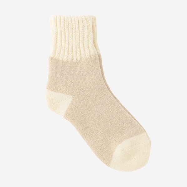 ローゲージのパイル編み機で作ったルームソックスはふんわりあたたか。くちゴム部分は特殊な編地でふんわりやわらか。足底部分にはすべりどめもついてます。