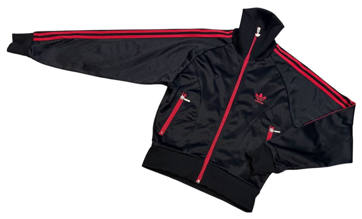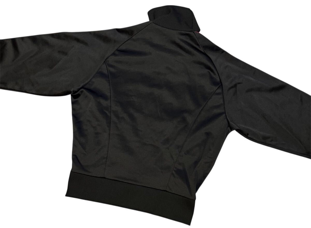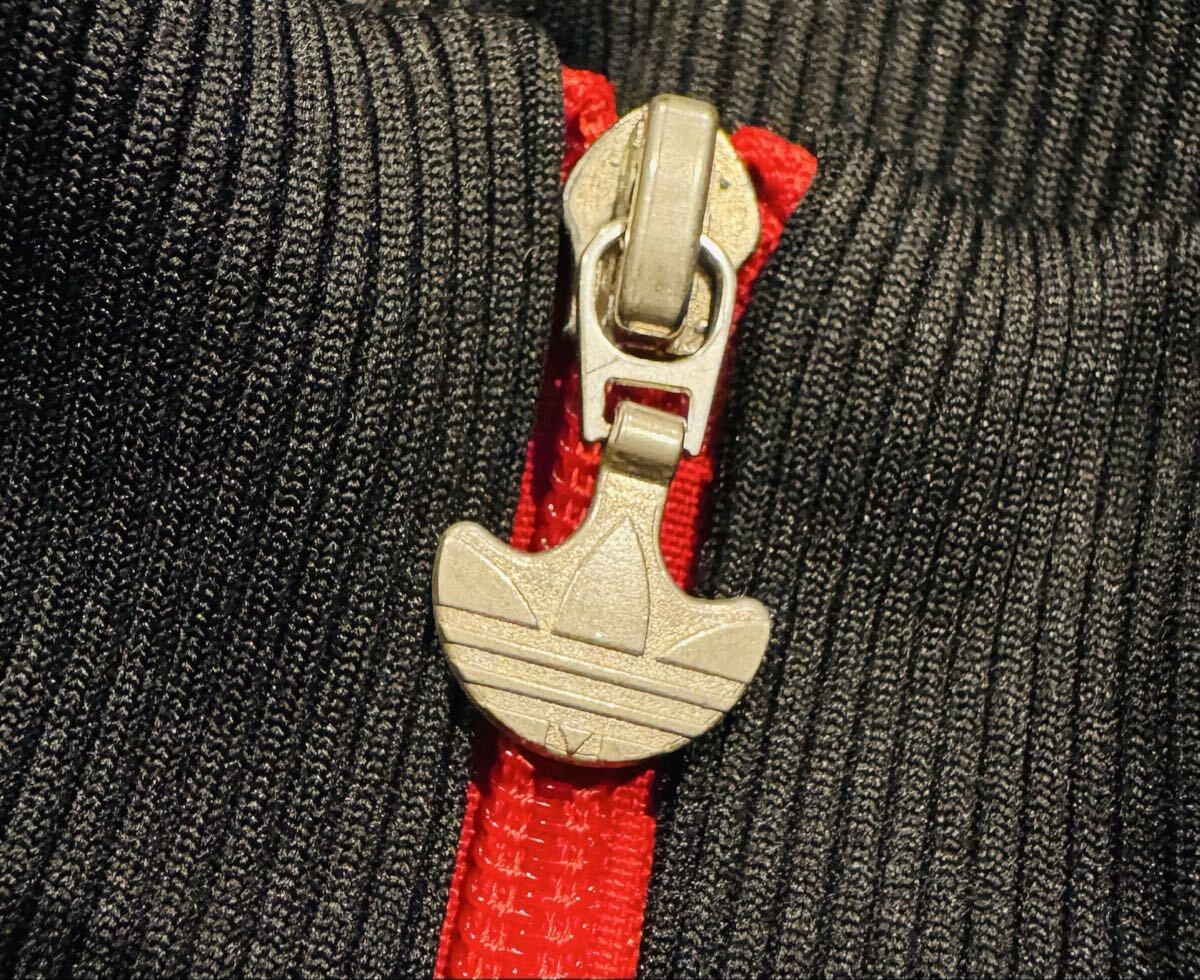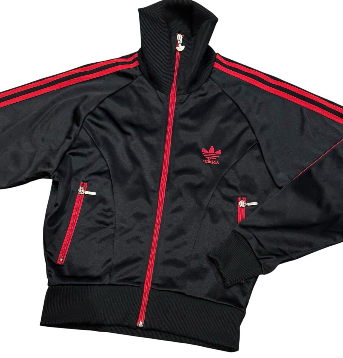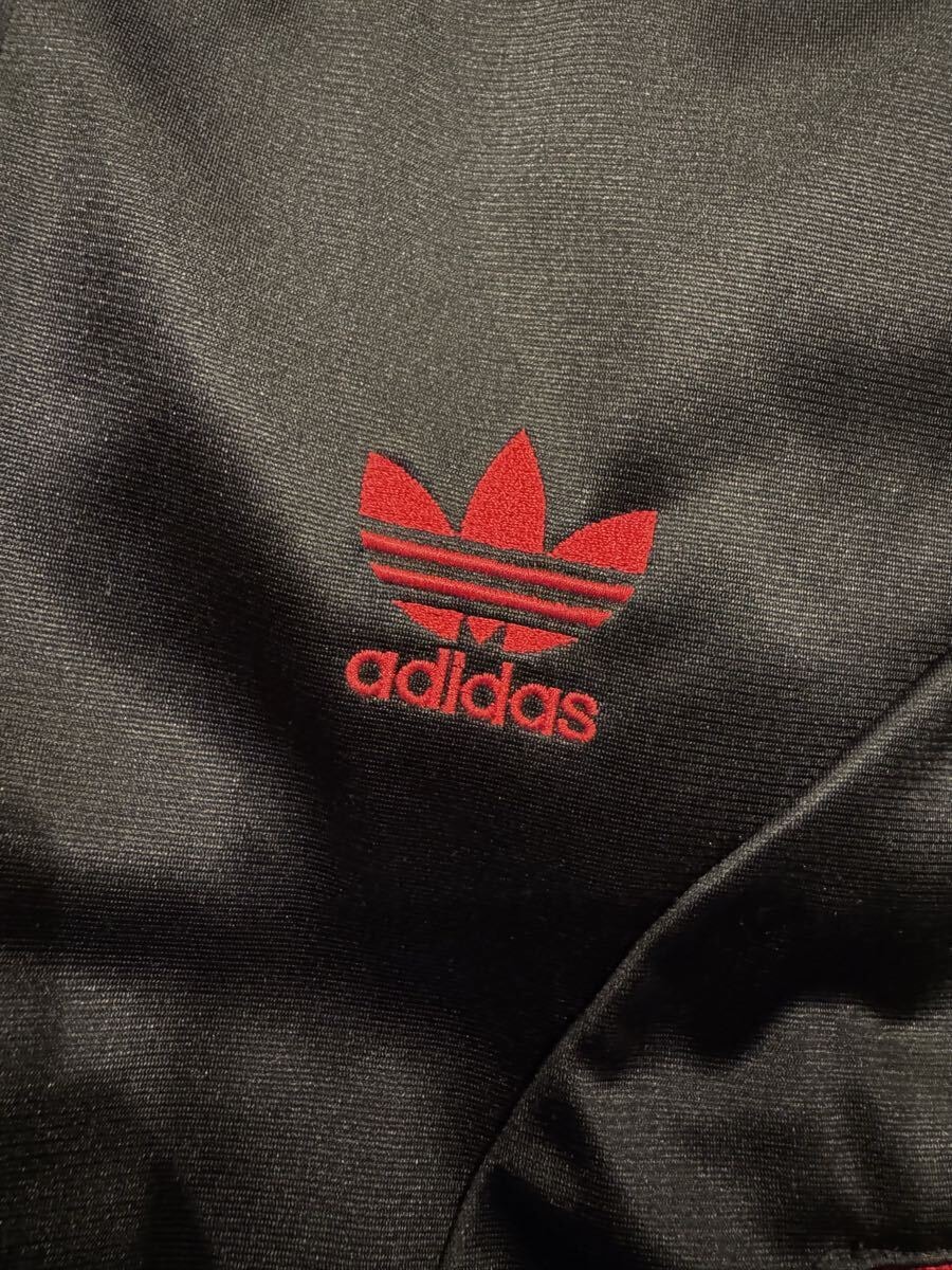 ADIDASのトラックジャケット、ブラック×レッドの配色でスタイリッシュなデザイン。