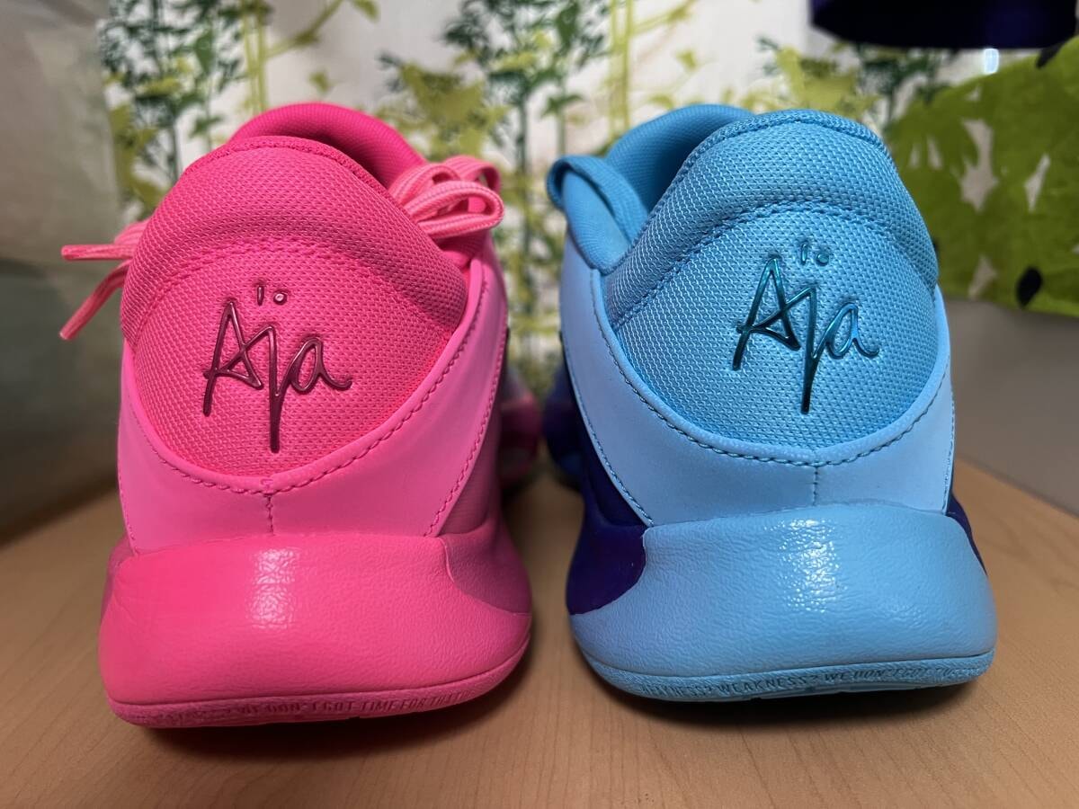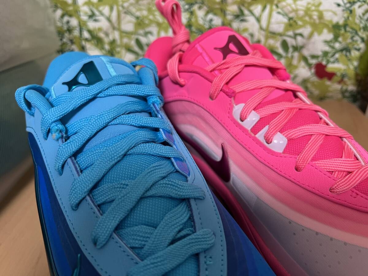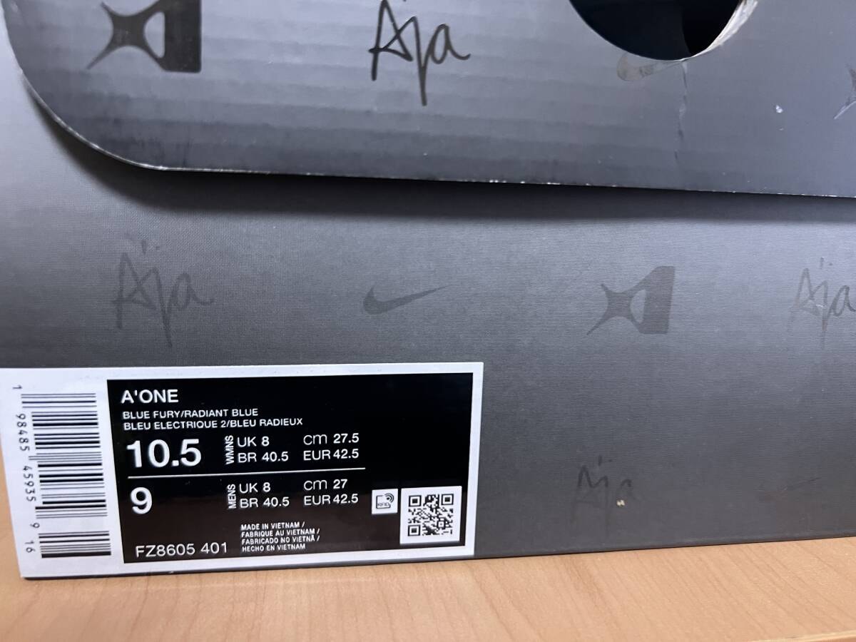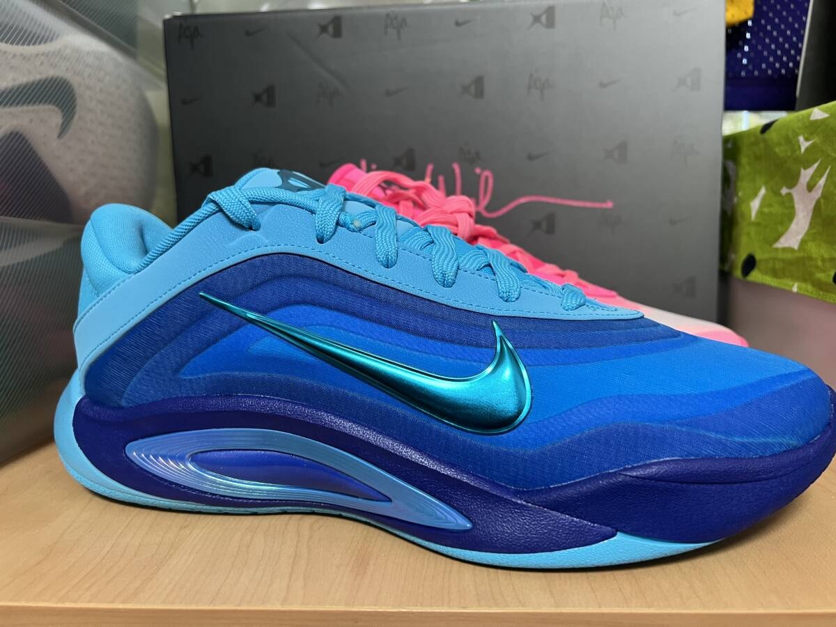NIKE A'ONE 日本未販売カラーになります 新品・箱ありになります メンズUS9・ウィメンズUS10.5 右足 blue furry FA8605-401 左足 a'ura pink FA8605-601 のアシンメトリーになっています どちらも海外限定カラーで日本には売っていないです レブロンの娘さんがバレーボールでこの履き方してました EPサイズでなくグローバルサイズになりますのでさらに細めです 足が細い人ならそのままのサイズでいいですが、足が広い人はハーフサイズかワンサイズダウンの人がいいと思います