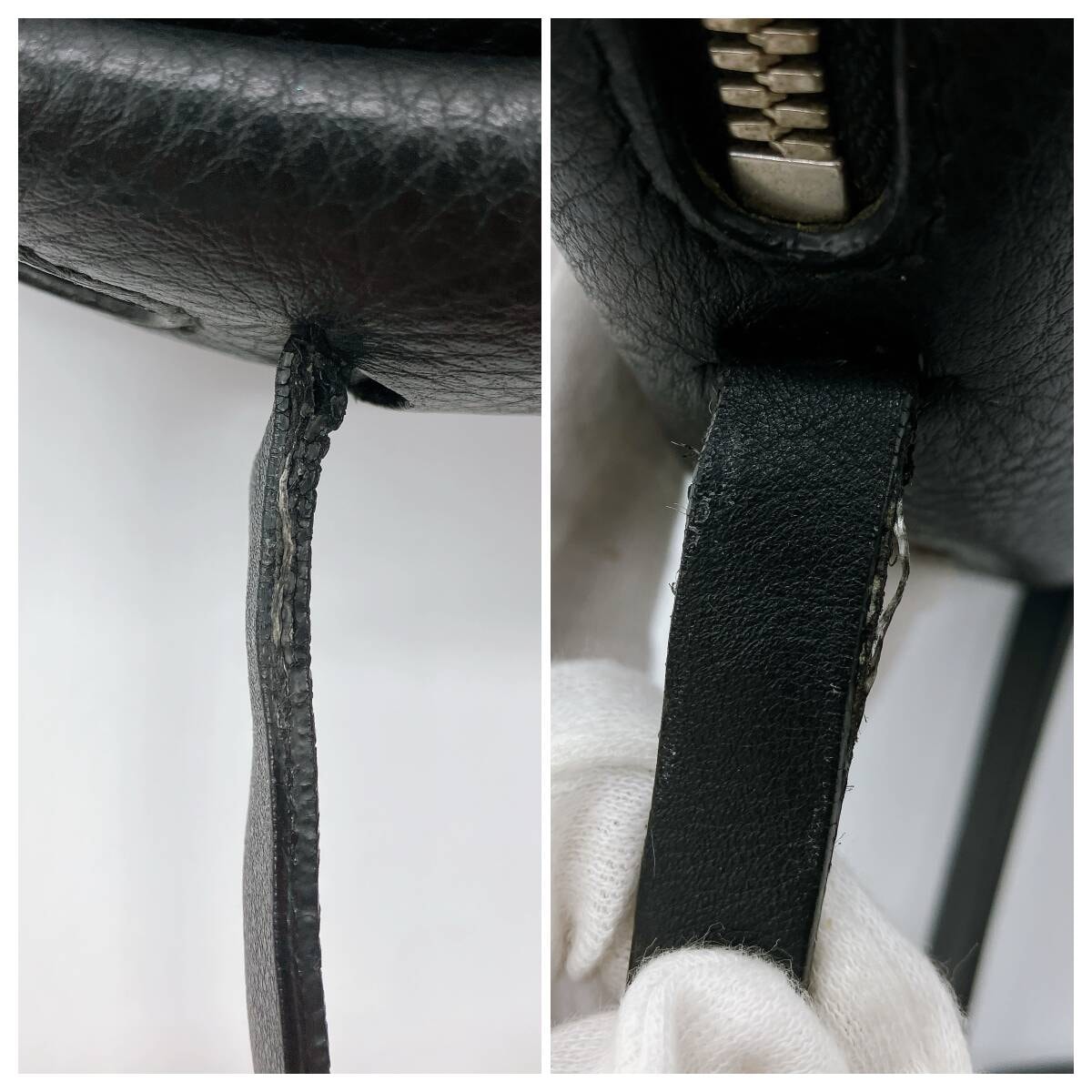 ブラックレザーのBALENCIAGAショルダーバッグ、ロゴデザインが特徴。