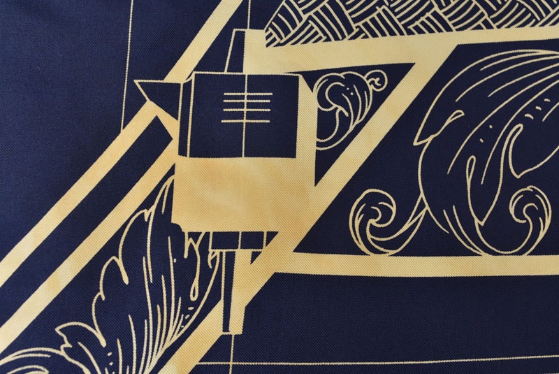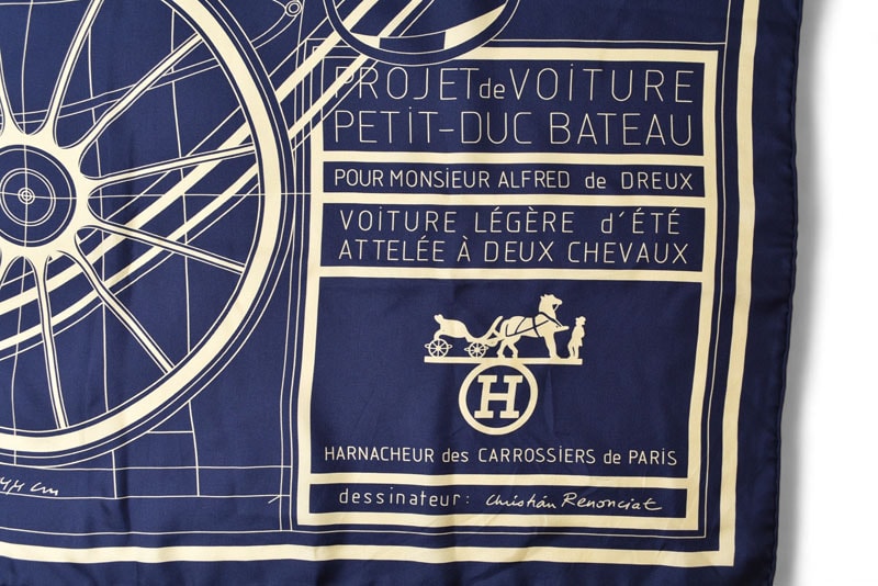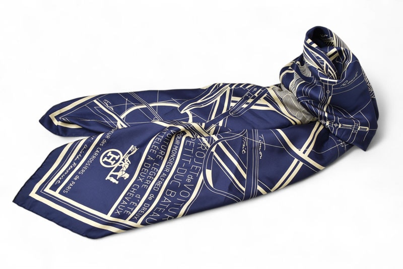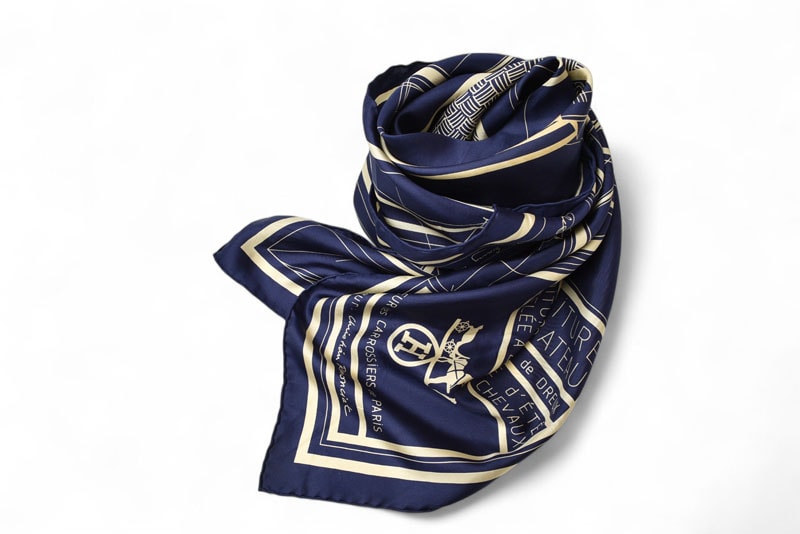 エルメスより、人気の小物、スカーフ/カレ/ショールです。馬具工房として創業したエルメスの歴史を象徴する、馬車と設計図が描かれたデザイン。上質な手触りのシルクで、気品を漂わせます。ショールにしたり、首に巻いたり、ヘアアクセサリーにしたりと、様々なアレンジが可能で、バリエーションが広がります。