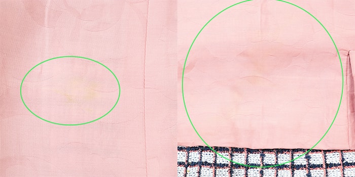 裏地にシミが複数ヶ所あるものの、クリーニングに出せば軽減できる程度で