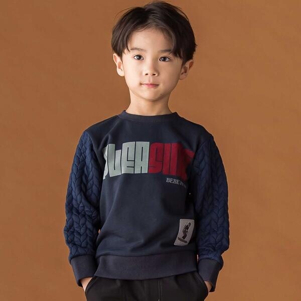 キルトジャガード袖と大胆フロッキープリントが映える男の子用トレーナー。