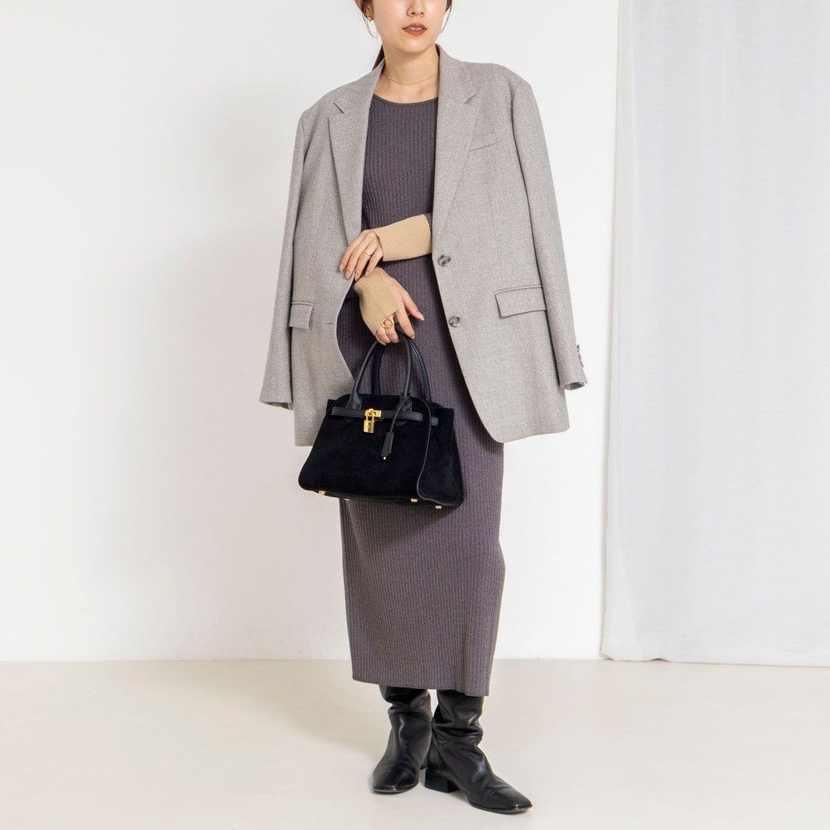 5部袖 水玉ワンピース ウール混 ドット ゆったり ダークグレー ホックボタン