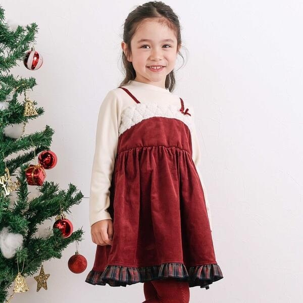 レッド:コーデュロイ素材のキャミソールドッキングデザインで、裾にはチェックのフリルをあしらい、かわいらしさを引き立てました。