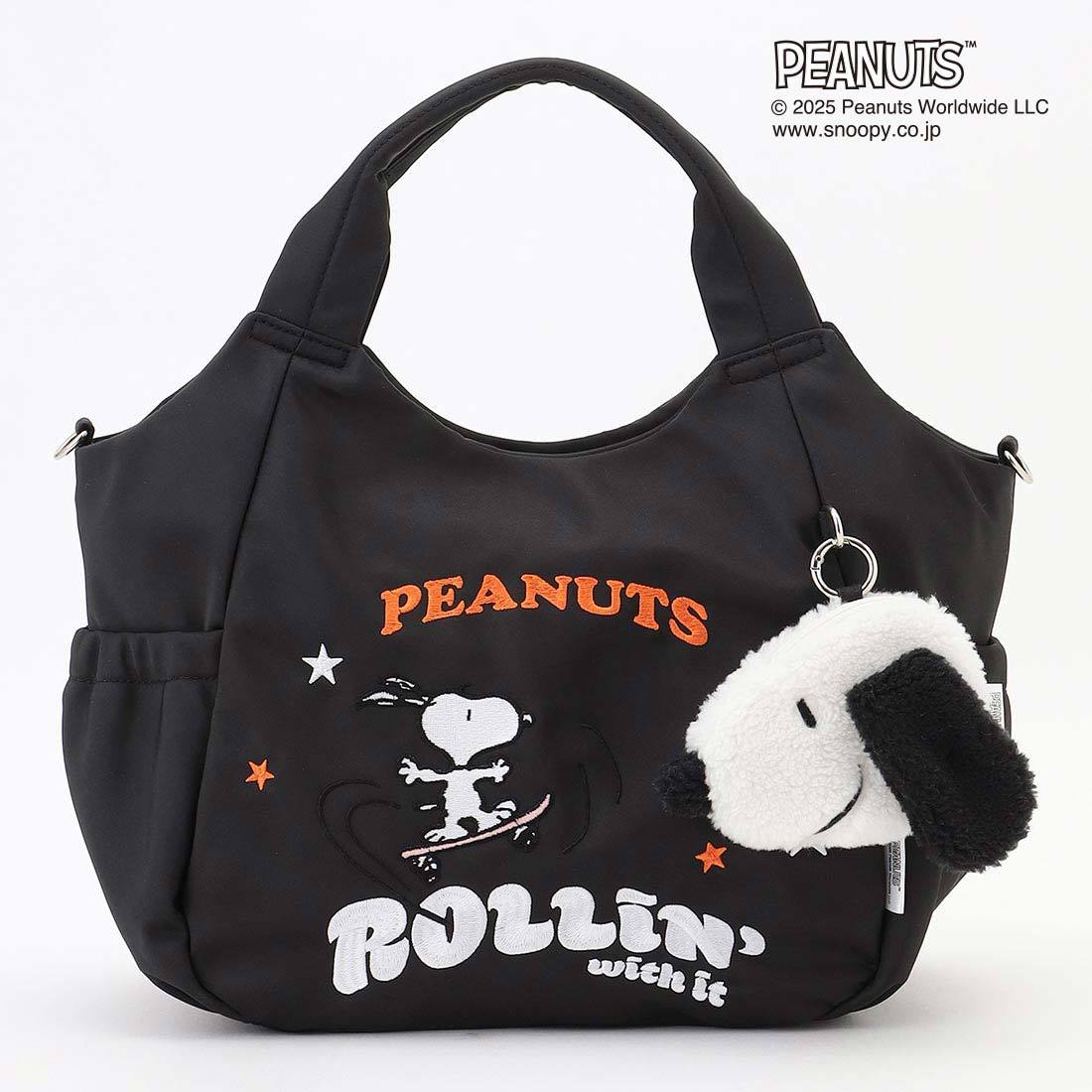 気軽に使えるナイロン素材に前面のスヌーピーのイラストの刺繍をあしらい、スヌーピーのフェイス型もこもこミニポーチがセットになったアイテム。