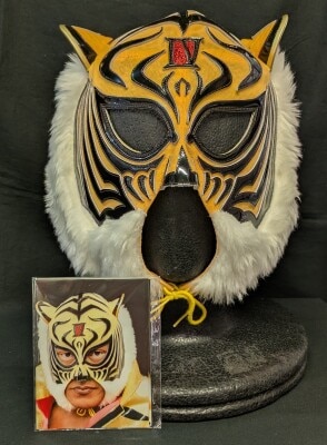 プロレスマスク マニア館製【初代タイガーマスク (金ラメ×黒・赤特殊フチ)】 4代目タイガーマスク サイン入り