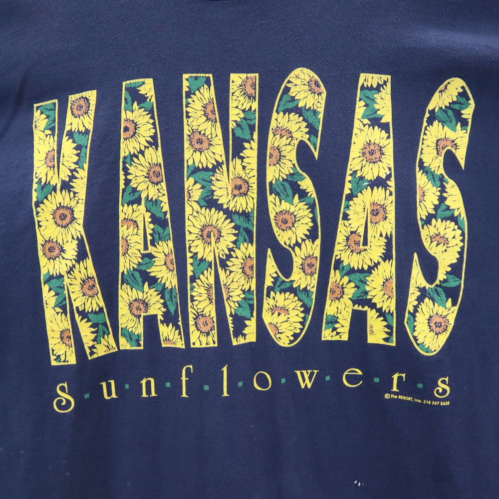 フルーツオブザルーム 90s USA製 プリント 半袖 KANSAS ヒマワリ Tシャツ XL ネイビー系 FRUIT OF THE LOOM オールド ヴィンテージ メンズ