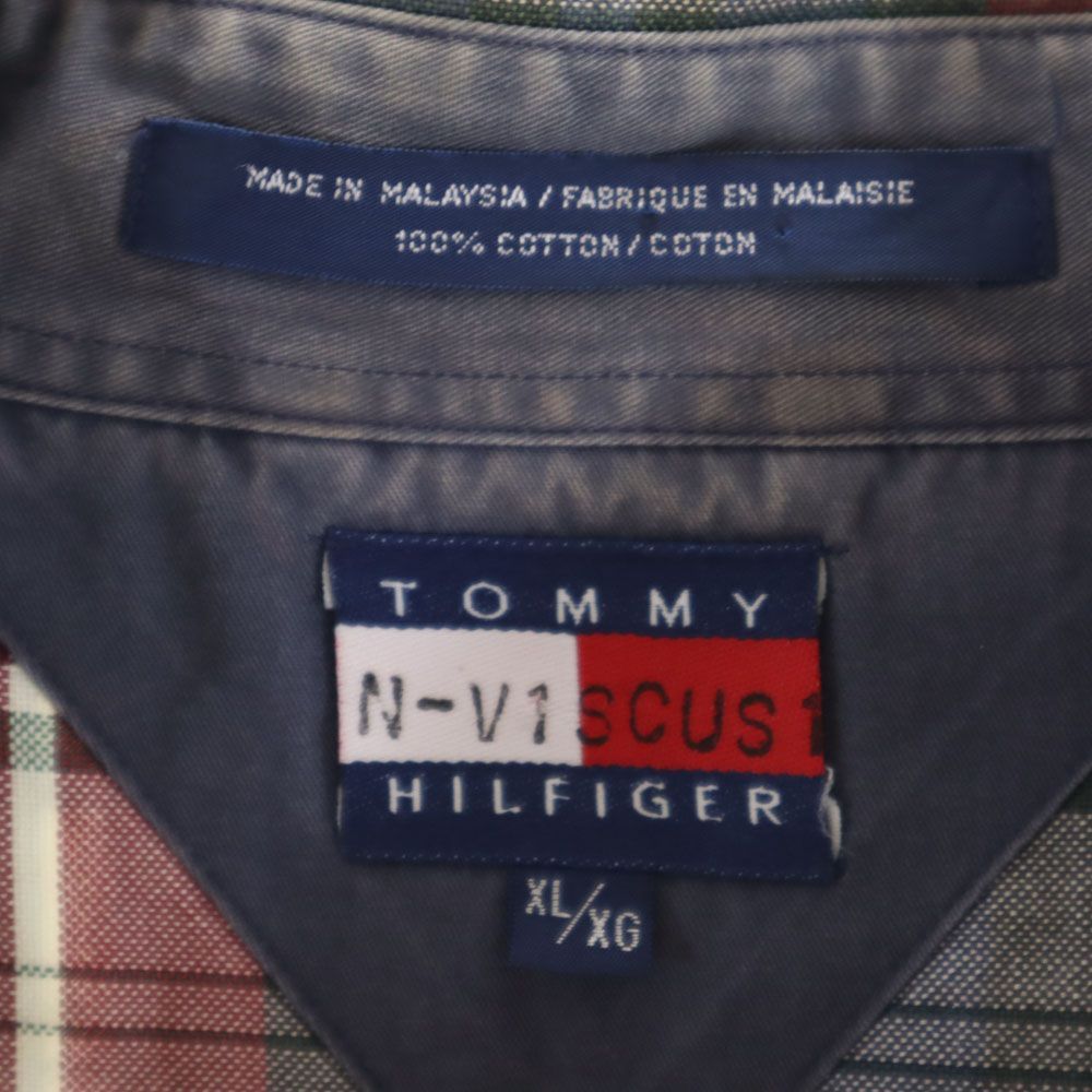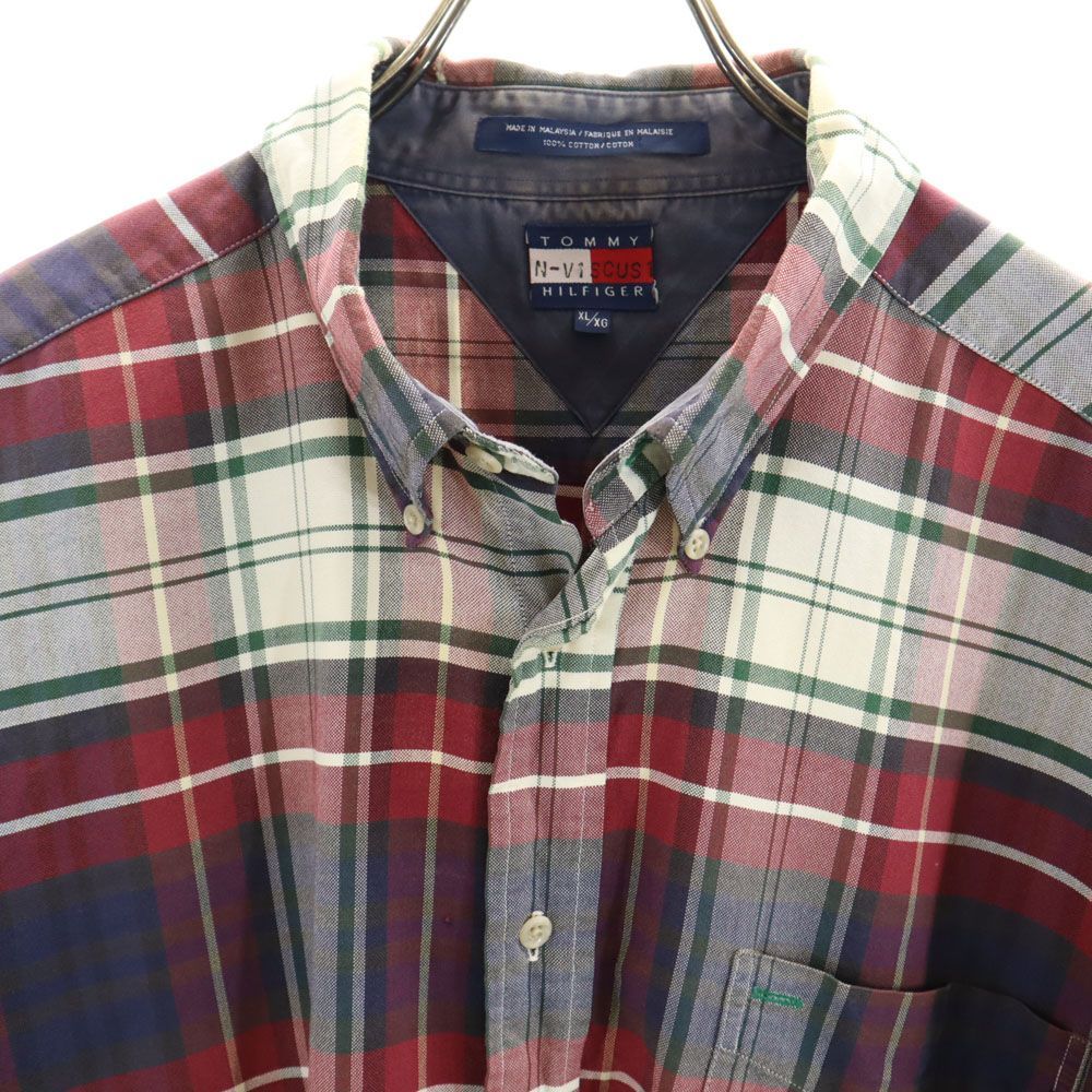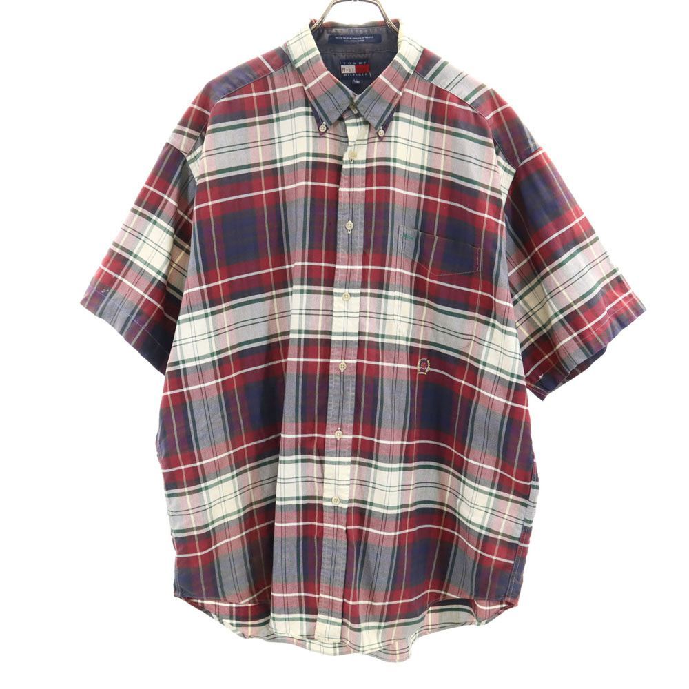 トミーヒルフィガー 90s オールド フラッグタグ チェック 半袖 ボタンダウンシャツ XL レッド系 TOMMY HILFIGER メンズ
