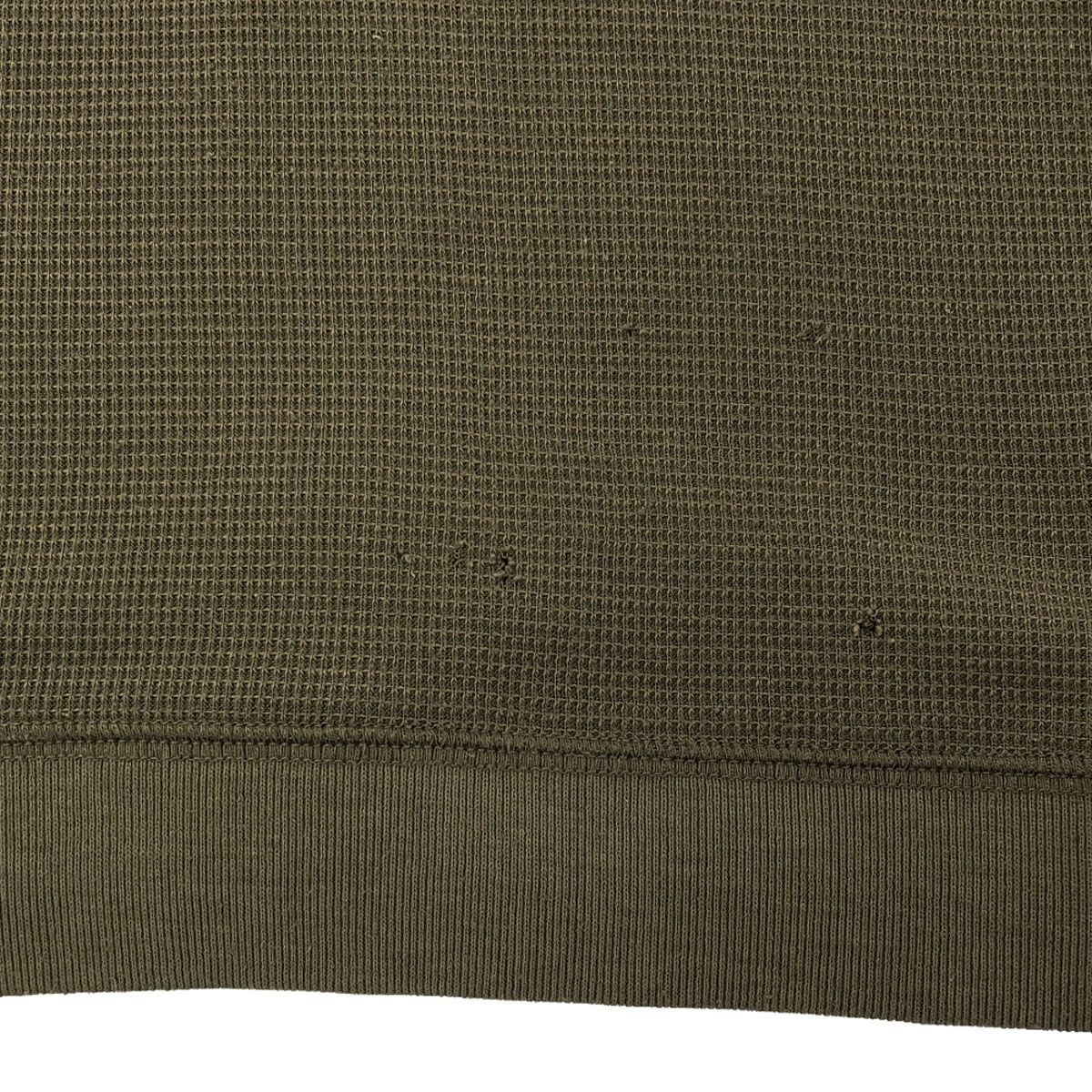 前身頃と両サイドに糸ほつれがあり、前身頃には汚れもあります。後身頃と左袖に穴があり、右袖口にインク汚れもあります。着用感がございますが、古着にご理解の上ご購入をお願い致します。