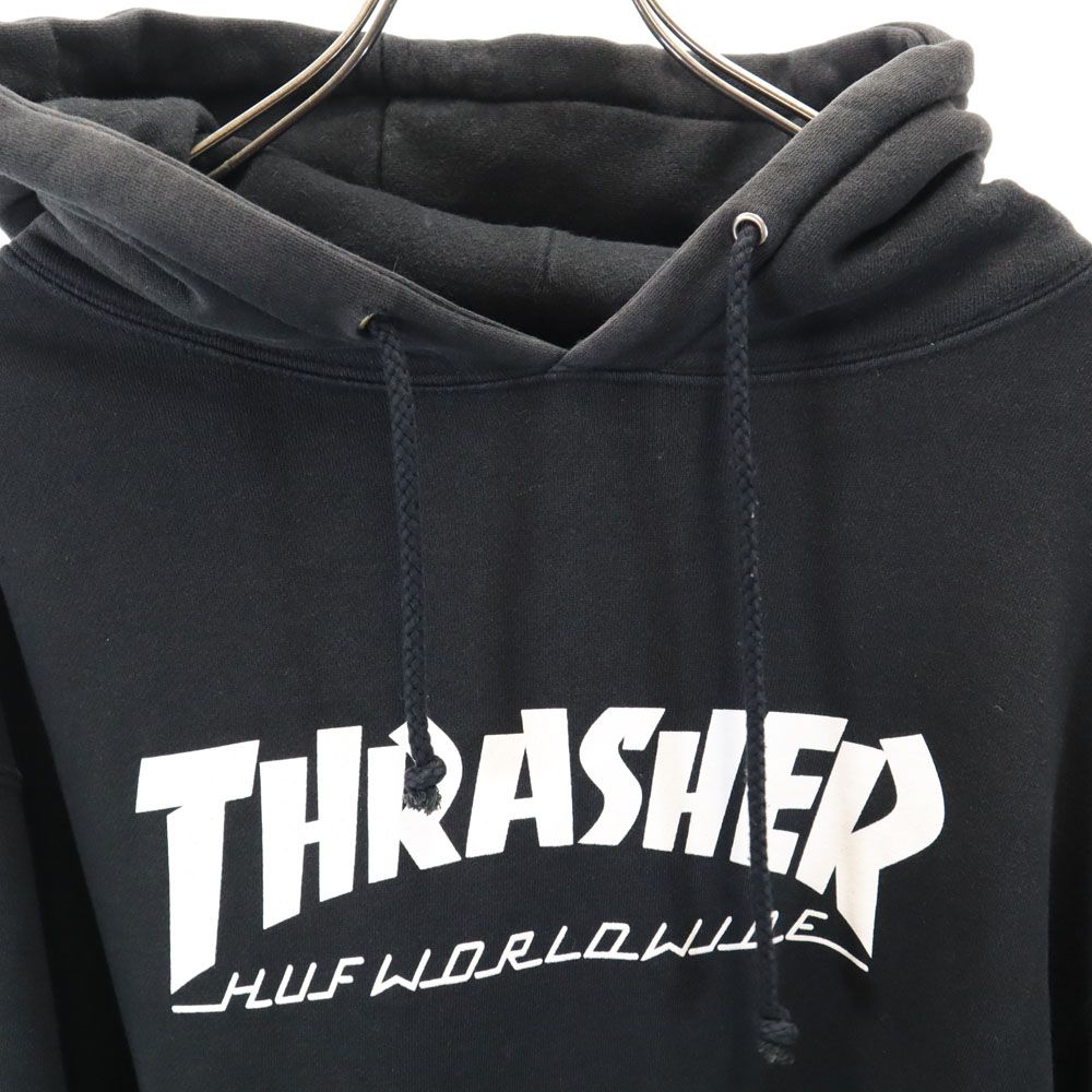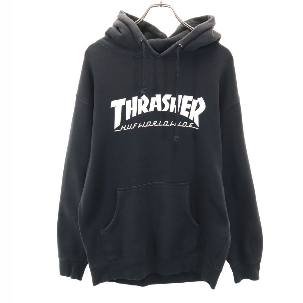 ハフ × スラッシャー コラボ バックプリント 長袖 スウェットパーカー M ブラック HUF × THRASHER 裏起毛 プルオーバー メンズ