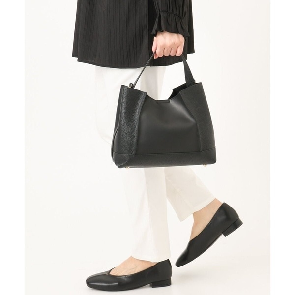 型押しとマットなフェイクレザーを切り替えたデザインハンドバッグ。
