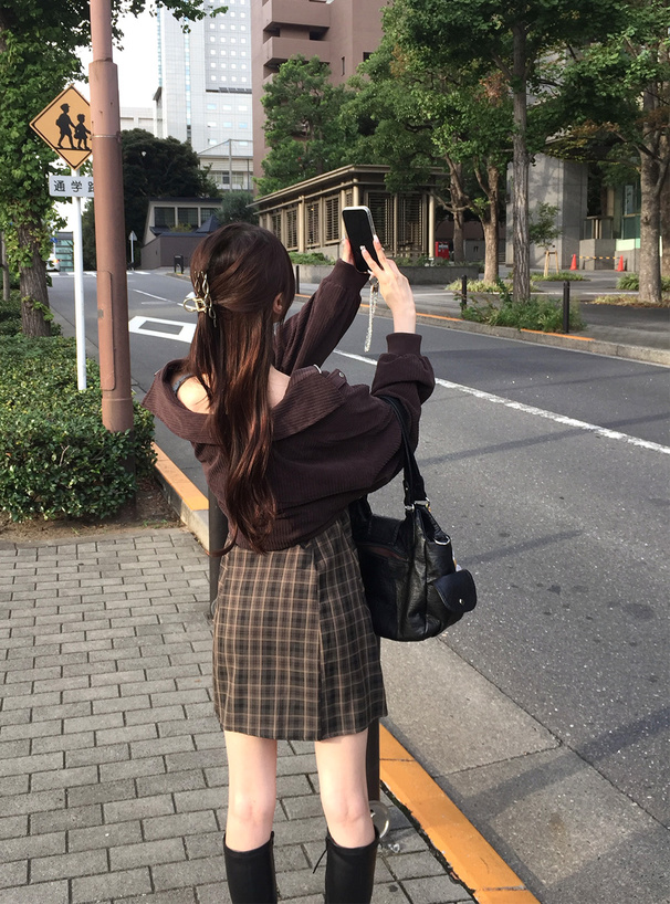 チェック柄リボンドッキングリブニットトップス[gn548a]