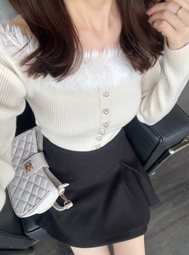チェーンを絡めたショルダー付きなので、フェミニンな印象を崩さず肩掛けにできる。