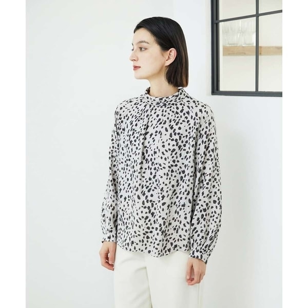 今シーズン注目のレオパードプリントのブラウスです。レオパードにありがちなギラギラとした印象がない、落ち着きのあるジオメトリック感覚の柄とカラーにしています。ほどよくカジュアルで上品なムードのプリント生地です。割繊の下地の落ち感を活かし、ロールネックの女性らしい雰囲気のブラウスに仕上げています。袖口カフスの内側にシャーリングステッチを施し、タックアップしやすくしているのもポイントです。