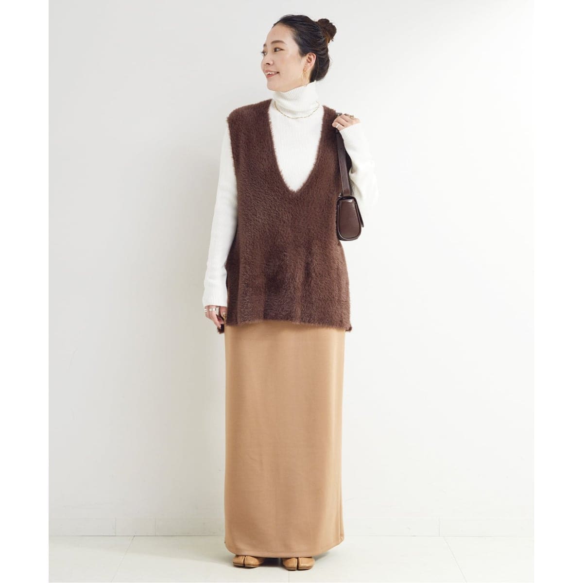 ふわっとフェミニンなベスト×スカートの女性らしさのあるセットアイテム。