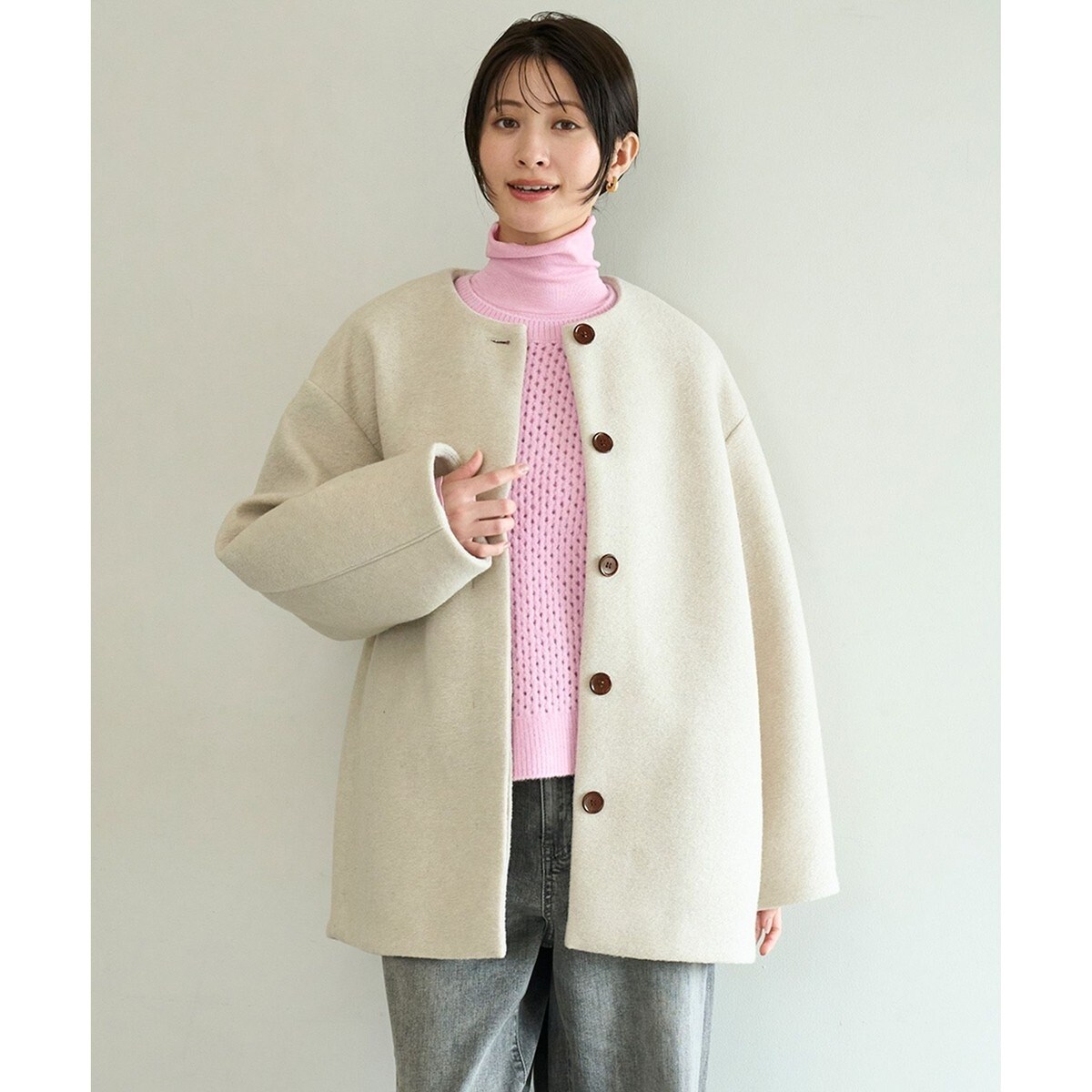 ■デザイン羽織るだけでサマになる、コクーンシルエットのボンディングコート。すっきりきれいめにこなせるクルーネックに、どんなスタイルにも決まりやすいミドル丈のデザインです。タートルやフーディなど、首元にボリュームのあるアイテム合わせもおすすめ。空気を含む3層素材で軽くて暖かく、ジャージーならではのラフな着心地も兼ね備えた万能アウターです。