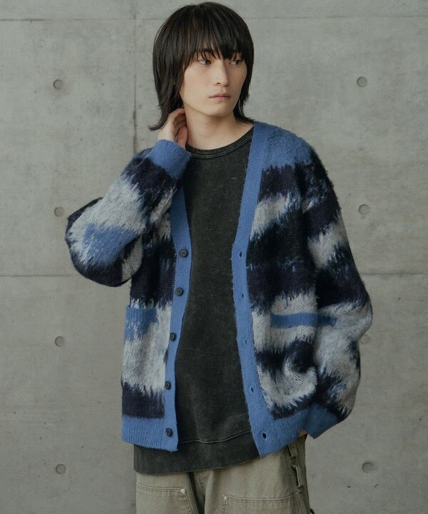 カモフラ柄をモダンに落とし込んだWジャガード編みのカーディガンです。