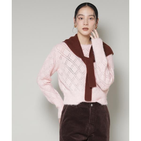 ふんわりヘアリーな質感のダイヤ柄透かしニットプルオーバー。程よくカジュアルで抜け感のある素材と、上品見えするサイズ感とのバランスがポイント。一枚ではもちろん、シャツとレイヤードしたこなれ感あるスタイルもおすすめです。
