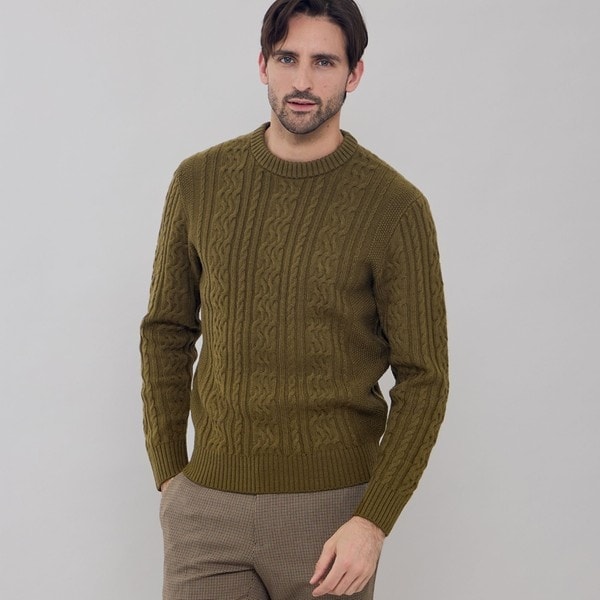 迫力のあるアラン模様のニットを引き立てるオーセンティックなデザインのクルーネックプルオーバーです。