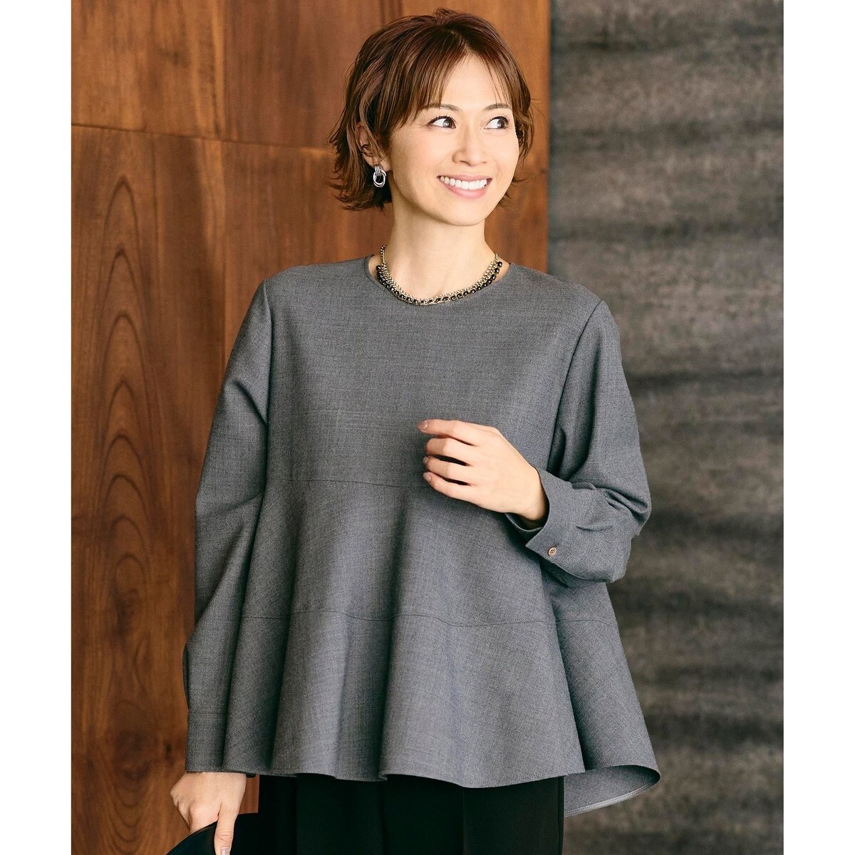フレア部分に切り替えが入ったデザインのペプラムブラウス■デザイン胸下の切り替えから裾にかけてフレアに広がるペプラムが特徴の長袖ブラウスです。フレア部分に切り替えを入れることで、甘い印象になりすぎないようにデザインしています。少しボリュームのあるお袖なので、上からジレを羽織ったり、中にインナーをレイヤードした着こなしもできるようになっています。■素材ウールの糸にストレッチ性のあるポリエステル糸を混紡しているサキソニー素材です。サキソニーならではのウォーム感と柔らかさ、コシのある風合いが特徴です。洗えて、シワが気になりにくいイージーケアウール素材です。■同素材アイテムワイドパンツ(PRW7LS0004)