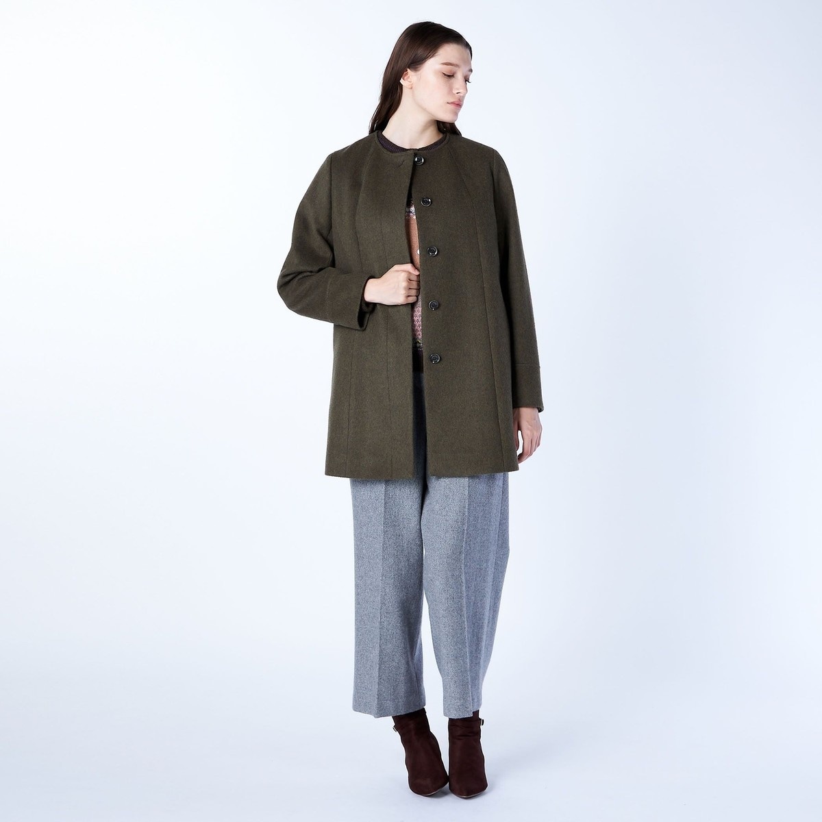 表面の仕上がりが美しい、ショートコート。首まわりのすっきりとしたノーカラーは、インにタートルニットやフーディーを合わせやすく、また上からマフラーやストールが巻きやすいのも魅力です。フロント部分や袖の切り替え、バックタックでシルエットを綺麗に仕上げ、袖を通したときに見映えするようにしました。オンオフ問わず、また流行にもとらわれず、長く愛用いただけます。