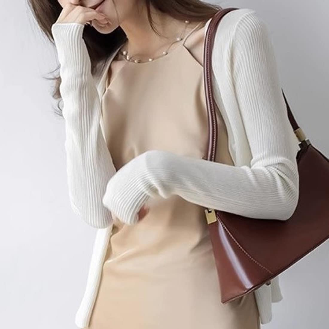 デコルテが綺麗に見えるネックラインと、細めのリブ編みで華奢に見えるシルエットが魅力。◎<br>