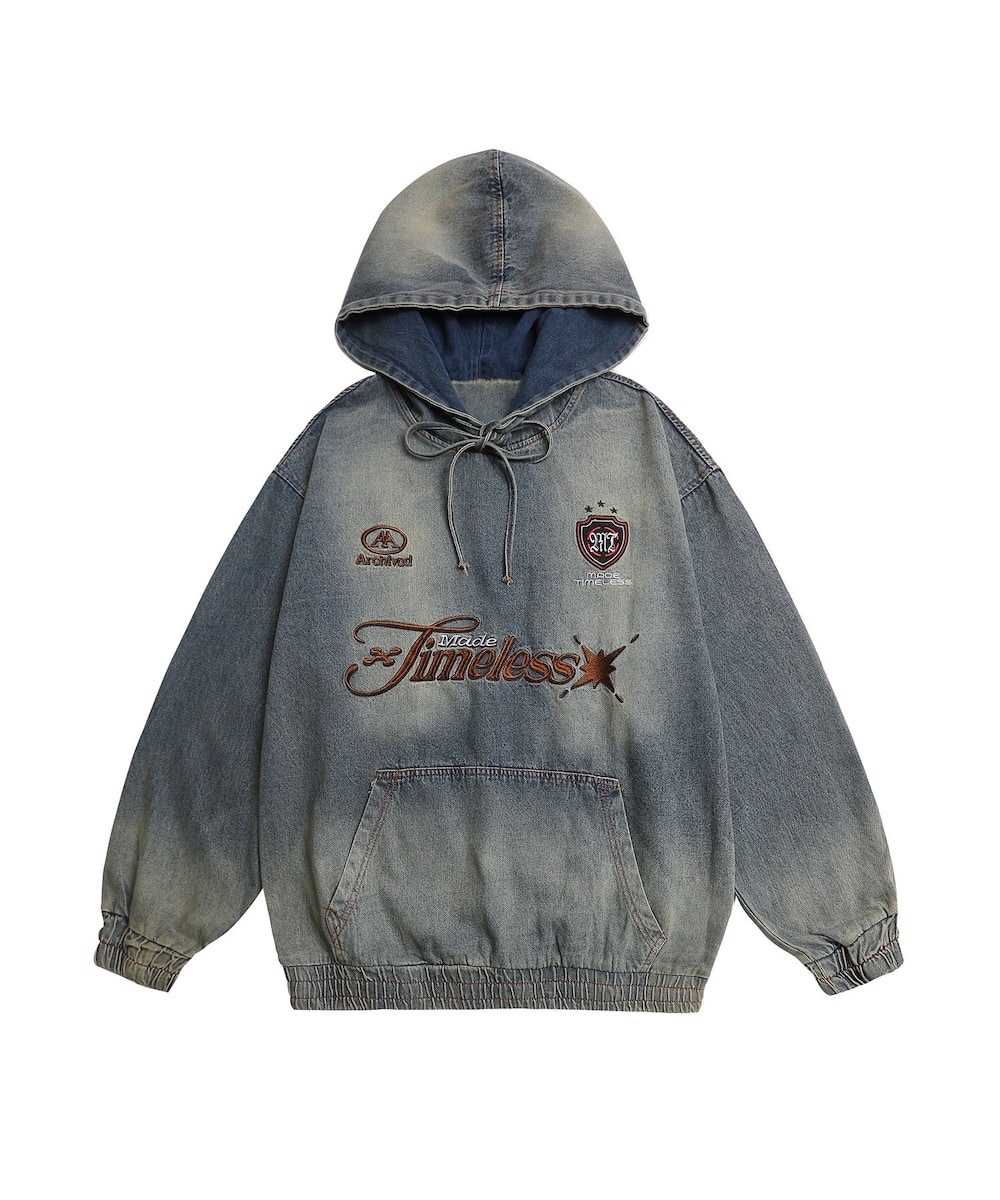 ヴィンテージ感のあるウォッシュドデニムを使用したデニムプルオーバーパーカー。