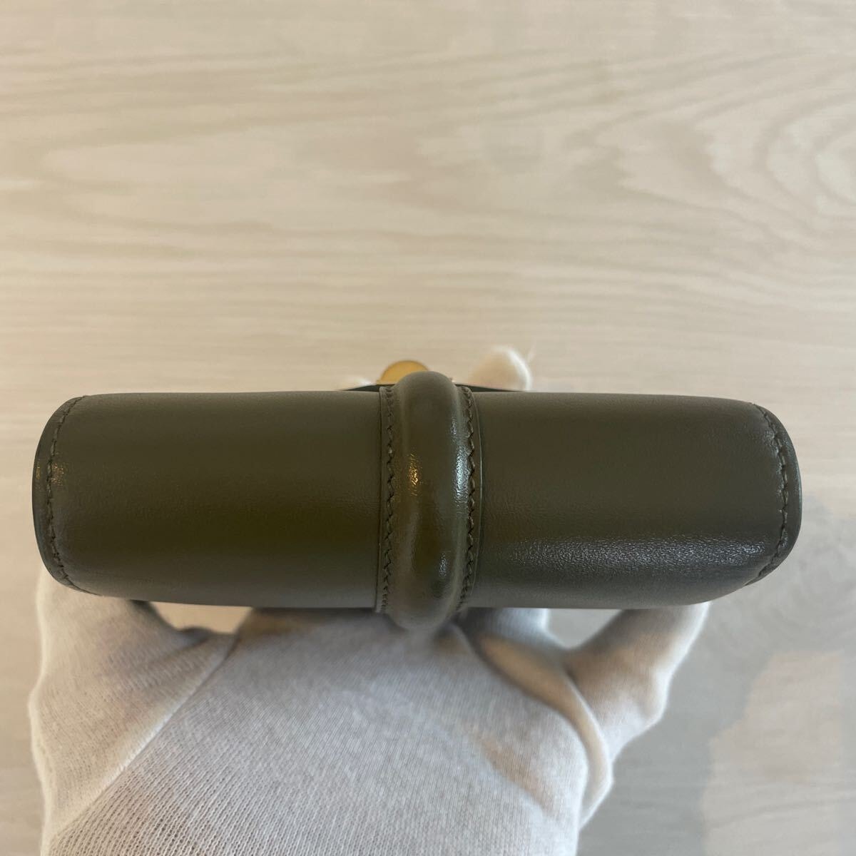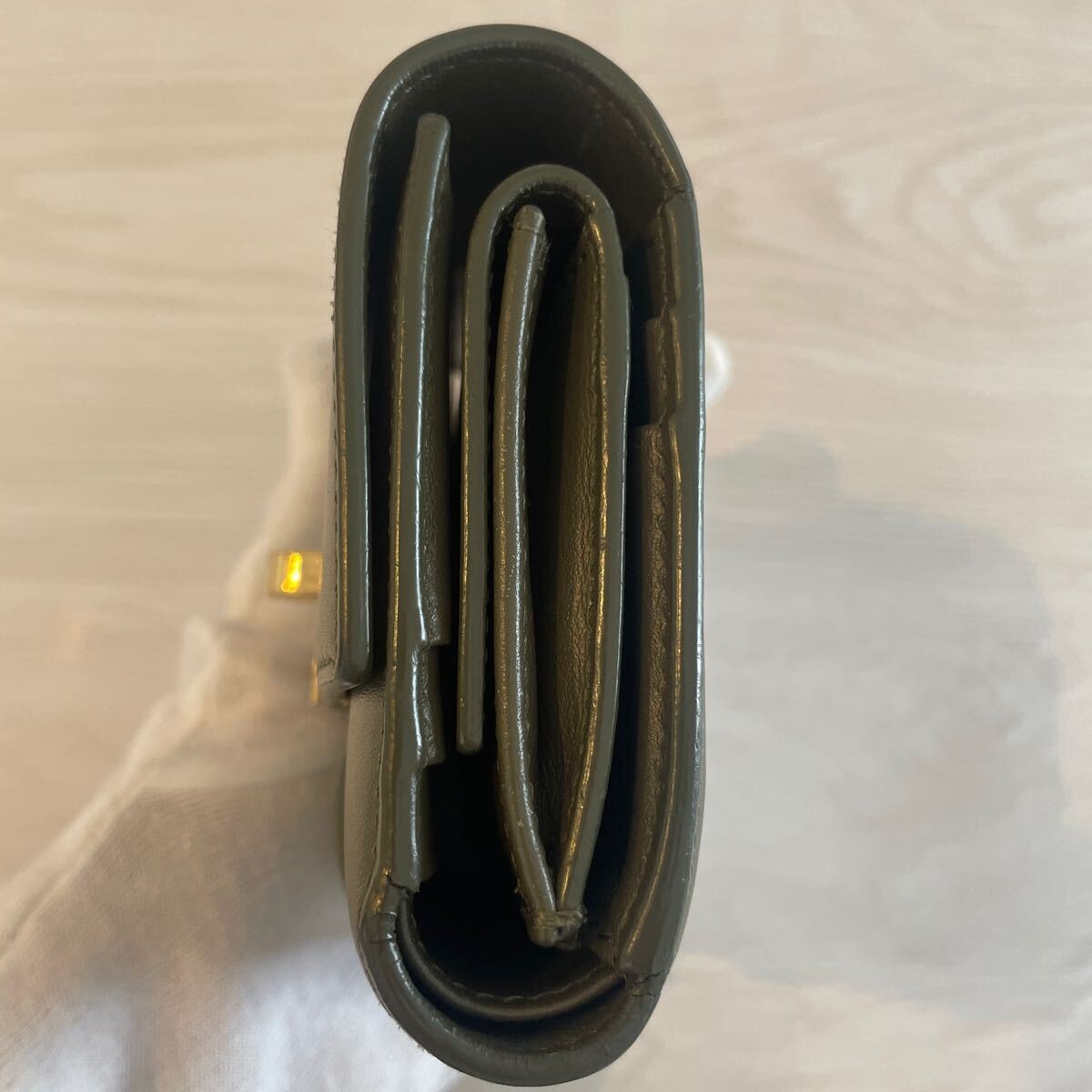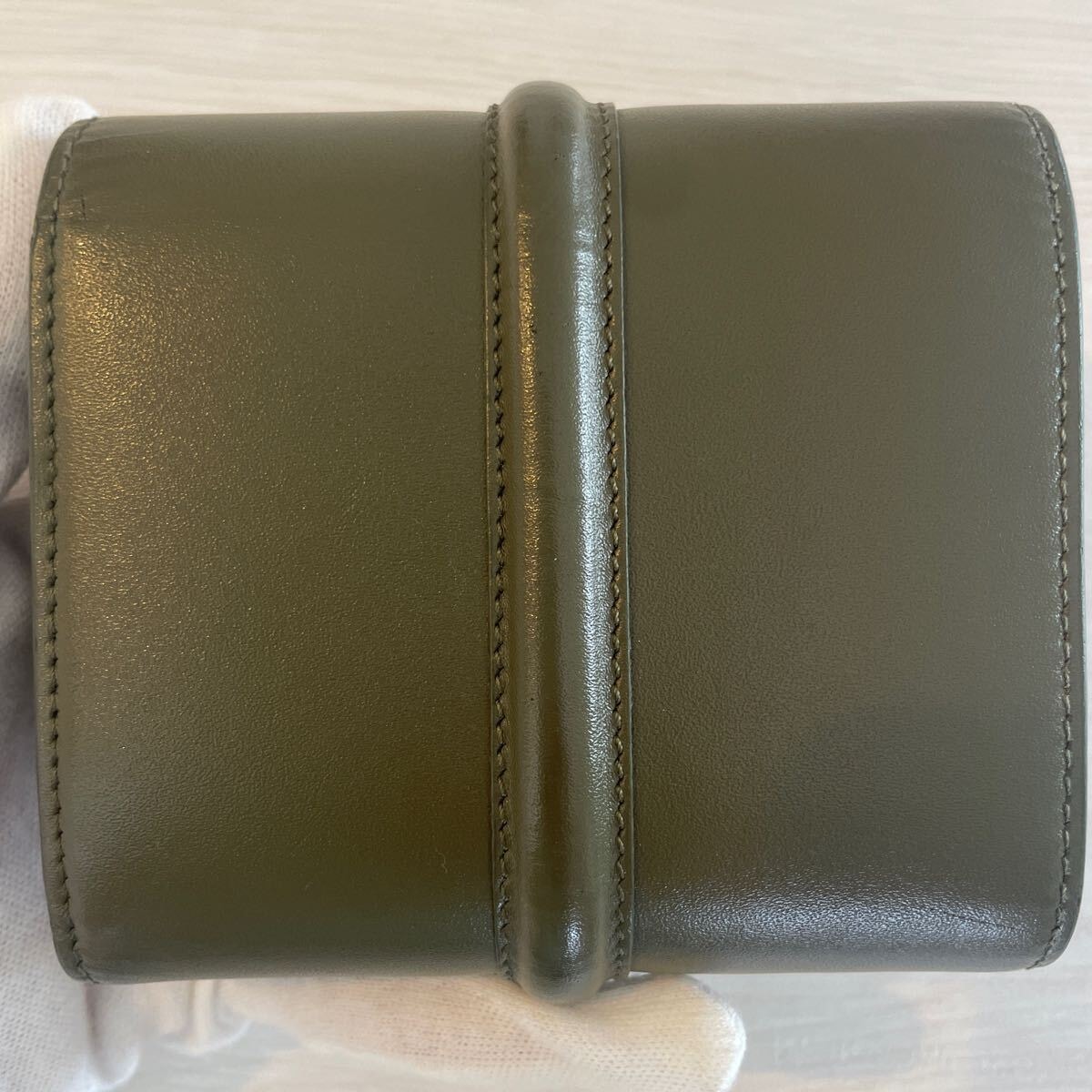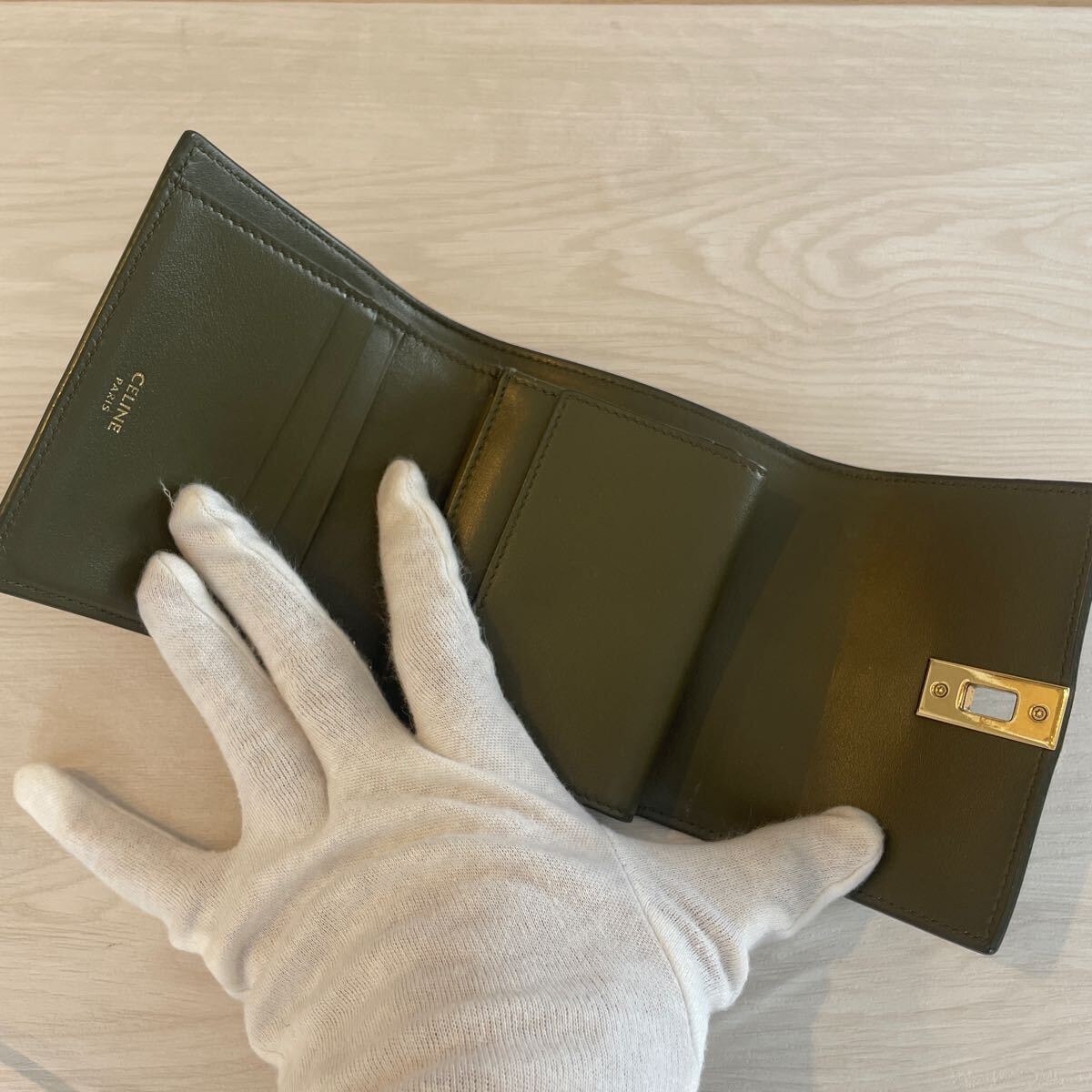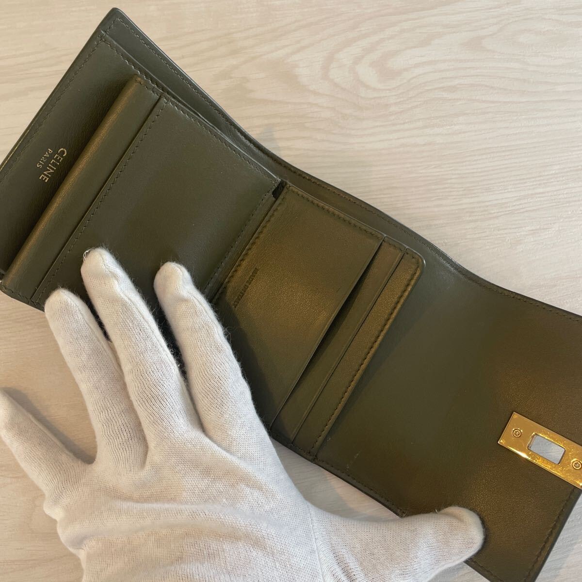 美品【セリーヌ】スモール トリフォールドウォレット 16(セーズ) / シャイニーカーフスキン 三つ折り財布 折財布 CELINE カーキ 緑 グリーン 深緑 オリーブ