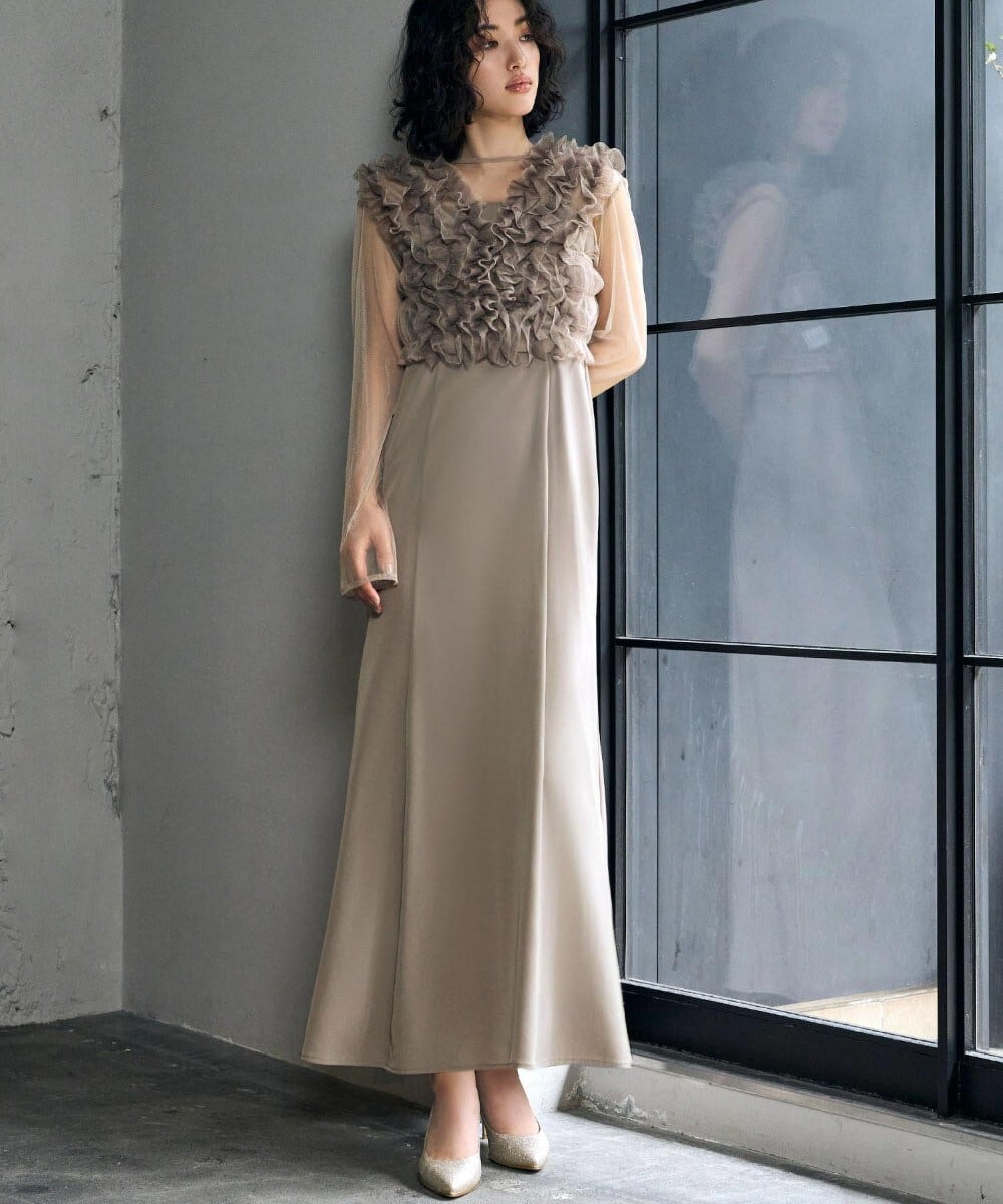 ポリエステル素材 / 無地 / フリル / ロング・マキシ丈 / 長袖 / ノースリーブ / S・7号以下あり / ドッキングワンピース / セパレート・セットアップワンピース / ボートネック / Aライン(シルエット) / フレアスカート / ロング・マキシ丈 / パーティー・結婚式・二次会