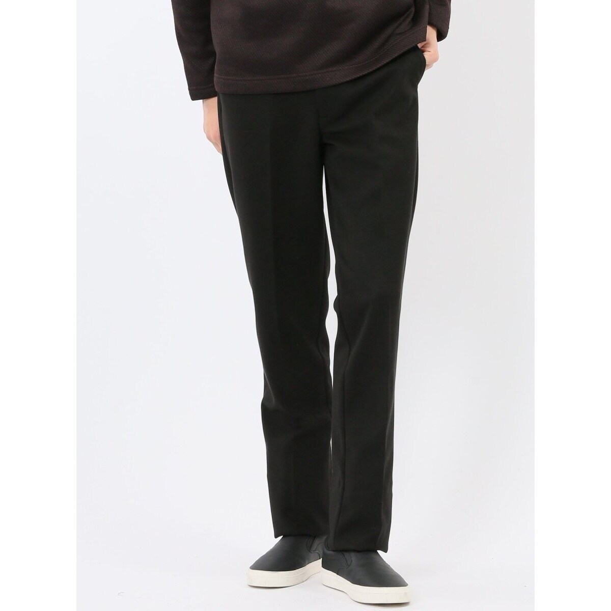 すっきりとしたノータックのテーパードパンツです。ウエストストレッチで着脱もスムーズ、着席時も窮屈感がありません。センタープレス加工、フロントファスナー、ベルト通し付き、前後ポケット付き、裾部分は未加工です。