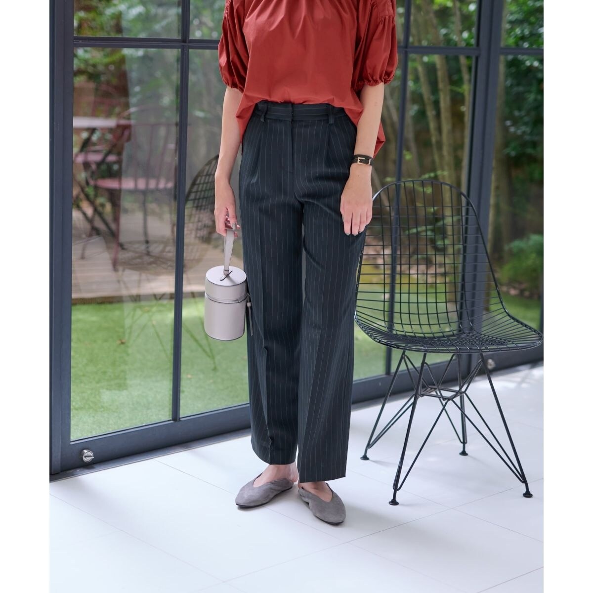 洗練された印象を与える、レトロシックなストライプ柄のワイドパンツ。程よいリラックス感がありながらもセンタープレスの入ったストレートシルエットで、シンプルながらも存在感を放つ一本です。バックウエストはゴム仕様となっており腰回りがもたつかず、すっきりしたフィットではき心地も快適。ハイウエストでスタイリングできるので脚長見せ効果も期待できそう。さまざまなトップスと相性がよく、これからの季節のコーディネートの幅を広げてくれる使い勝手のよいアイテムです。スナップボタン、ホック&ファスナーにより開閉が可能。