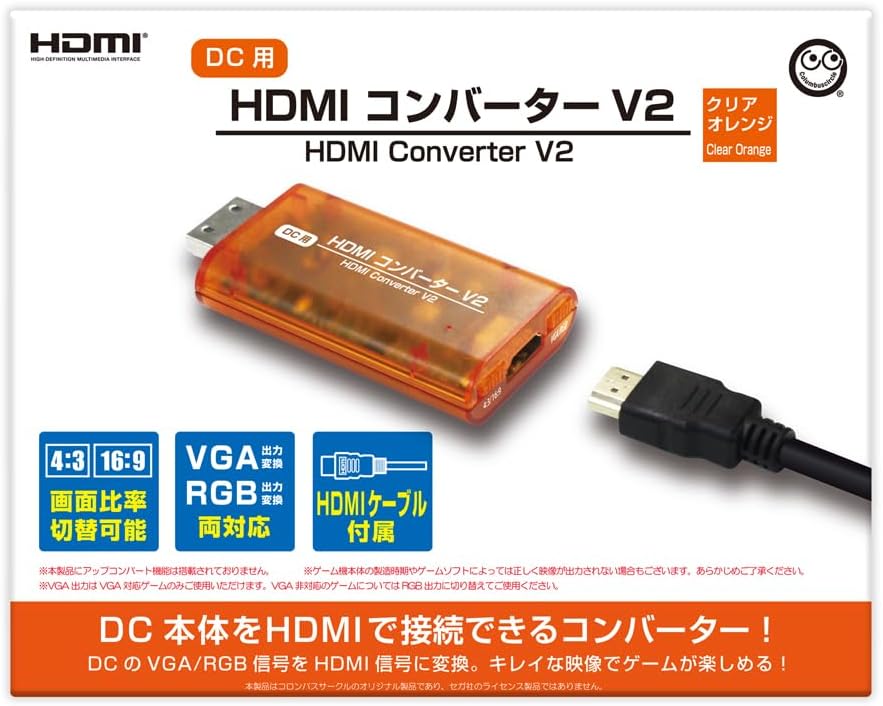 懐かしの名機「ドリームキャスト本体」で使えるHDMIコンバーターに、VGA出力・RGB出力の両方に対応した「V2」が登場!この製品で現代のテレビにDC本体を「HDMIケーブル」で接続して、名作揃いのDC用ゲームを今こそ楽しもう!【VGA出力・RGB出力の両方に対応!機能大充実のドリームキャスト本体用「HDMIコンバーター」!】本製品「(DC用)HDMIコンバーター V2<クリアオレンジ>」は、懐かしのゲーム機「ドリームキャスト」本体に対応した、「映像出力変換コンバーター」製品です。本製品をお使い頂く事で、DC本体をTVに繋げる際に、現代のTV環境で便利に使用できる「HDMIケーブル」を使った接続方法が可能になります。当時楽しんだ懐かしのDC用ゲームを今の時代のTVで楽しみたいと思った方や、現在もDC本体をお遊びの方におすすめしたい便利なDC用周辺アクセサリー製品です。本製品「V2」は充実の機能として、「VGA出力変換」・「RGB出力変換」を切り替えられる、「VGA/RGB変更スイッチ」を搭載しています。この機能を搭載したことで、「VGA対応のゲーム」、「VGA非対応のゲーム」、どちらでも本製品をお使い頂けるようになり、VGA出力対応のゲームソフトでは、VGA出力のキレイな映像でゲームがお楽しみ頂けます。また、画面比率切り替えスイッチも搭載しておりますので、当時遊んだ環境を再現した「スタンダード(4:3)」と、現代のテレビの仕様に合わせた「ワイド(16:9)」をいつでも切り替え可能です。そして本製品の製品カラーには、ノスタルジックなスケルトンカラー「クリアオレンジ」を採用いたしました。本製品を便利にご活用いただき、名作揃いのDC用ゲームを今こそ遊び尽くしましょう!※対応解像度:1080p ※本製品にアップコンバート機能は搭載されておりません ※本製品は、全てのゲームでの完全な動作を保証するものではありません。ゲームによっては正しく映像が出力されない場合があります。