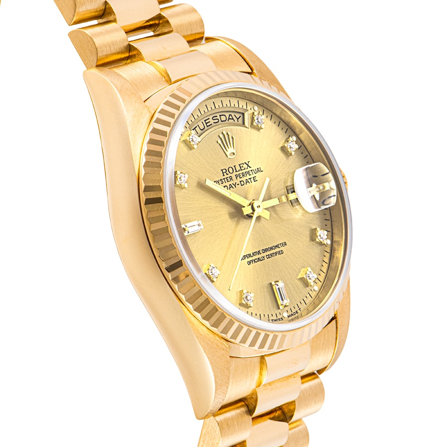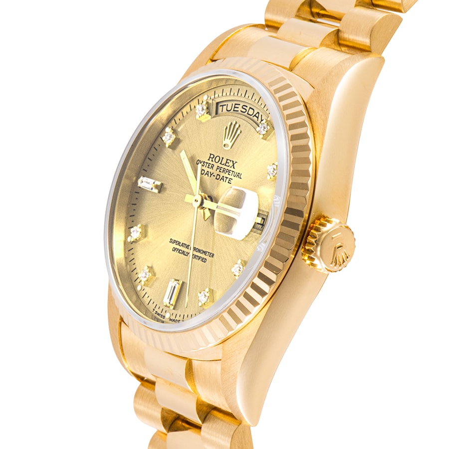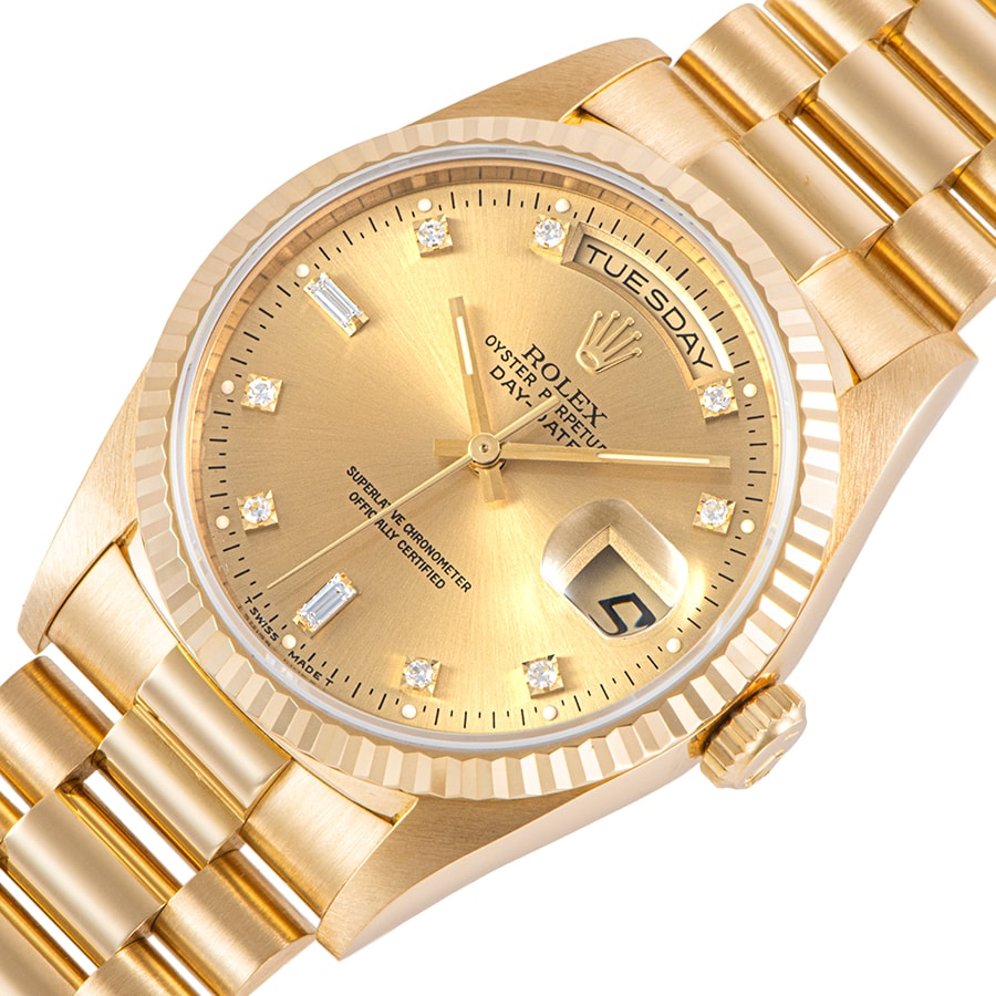 綺麗なシャンパンダイアルに8Pダイヤ、2Pバケットダイヤをセッティングした華やかなモデルです。